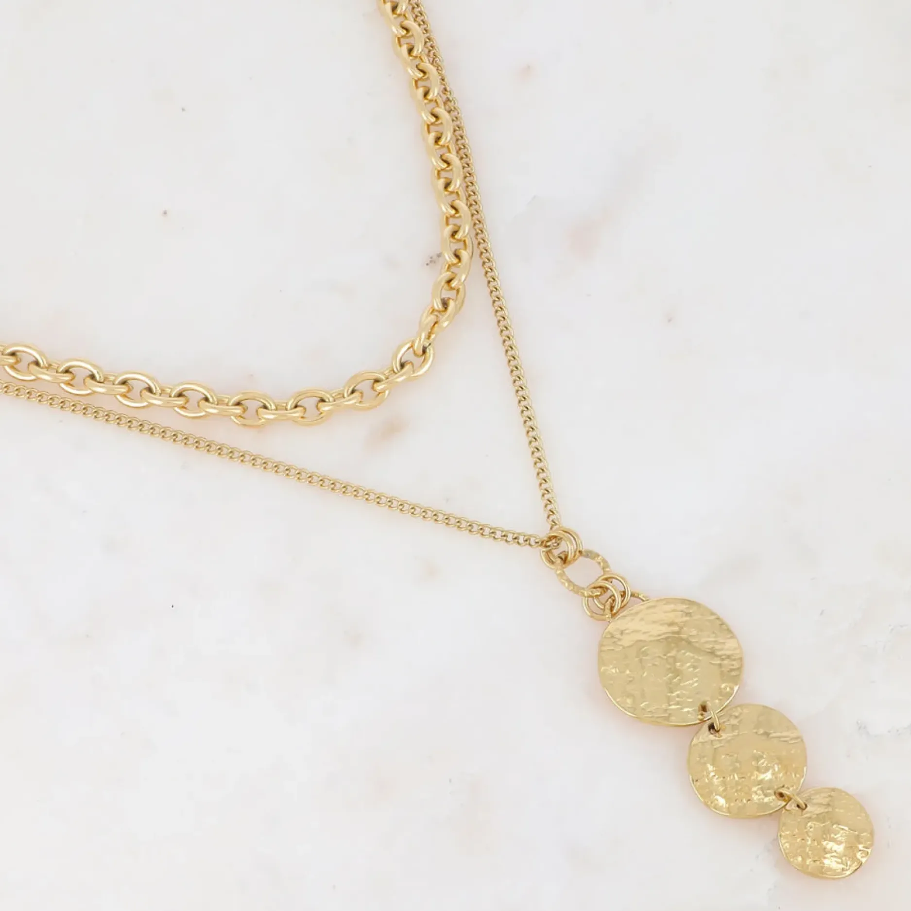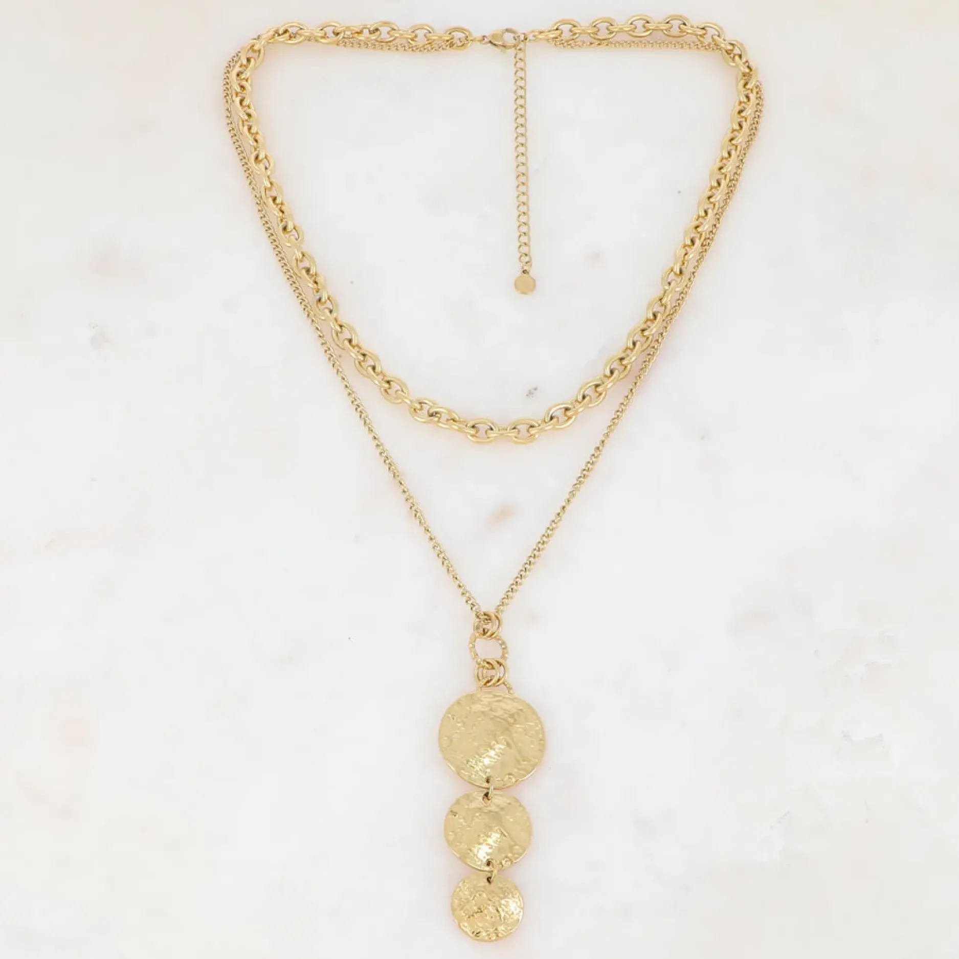 Offrez-vous un look unique avec notre Collier Pièces Rondes Martelées! Composé de plusieurs pièces martelées, ce collier en acier inoxydable est hypoallergénique et résiste à l’eau. Avec son fermoir mousqueton et chaînette de réglage, il s’adapte à toutes les tenues. Profitez d’un style moderne et durable avec ce collier double rangs !