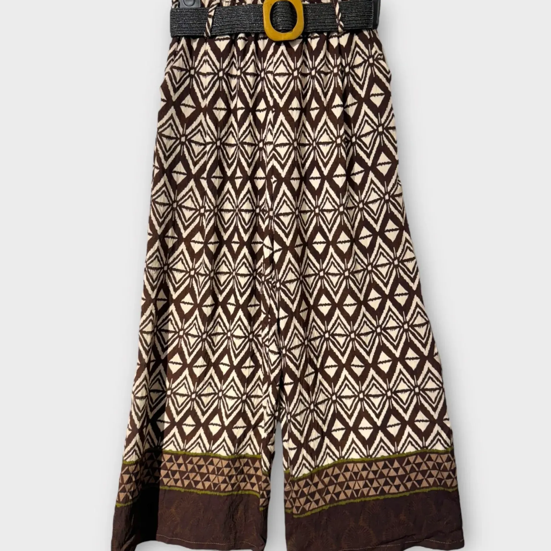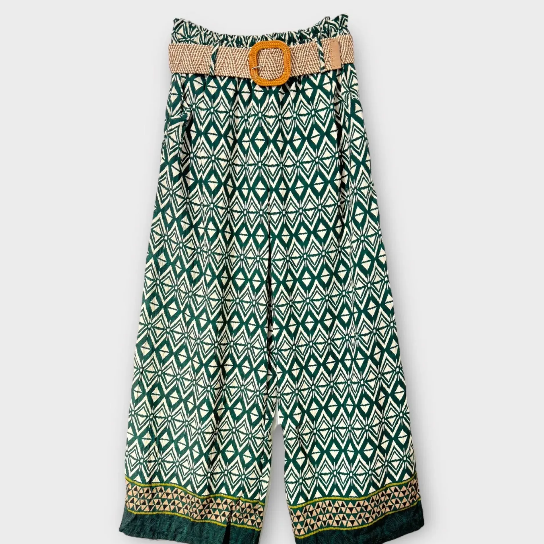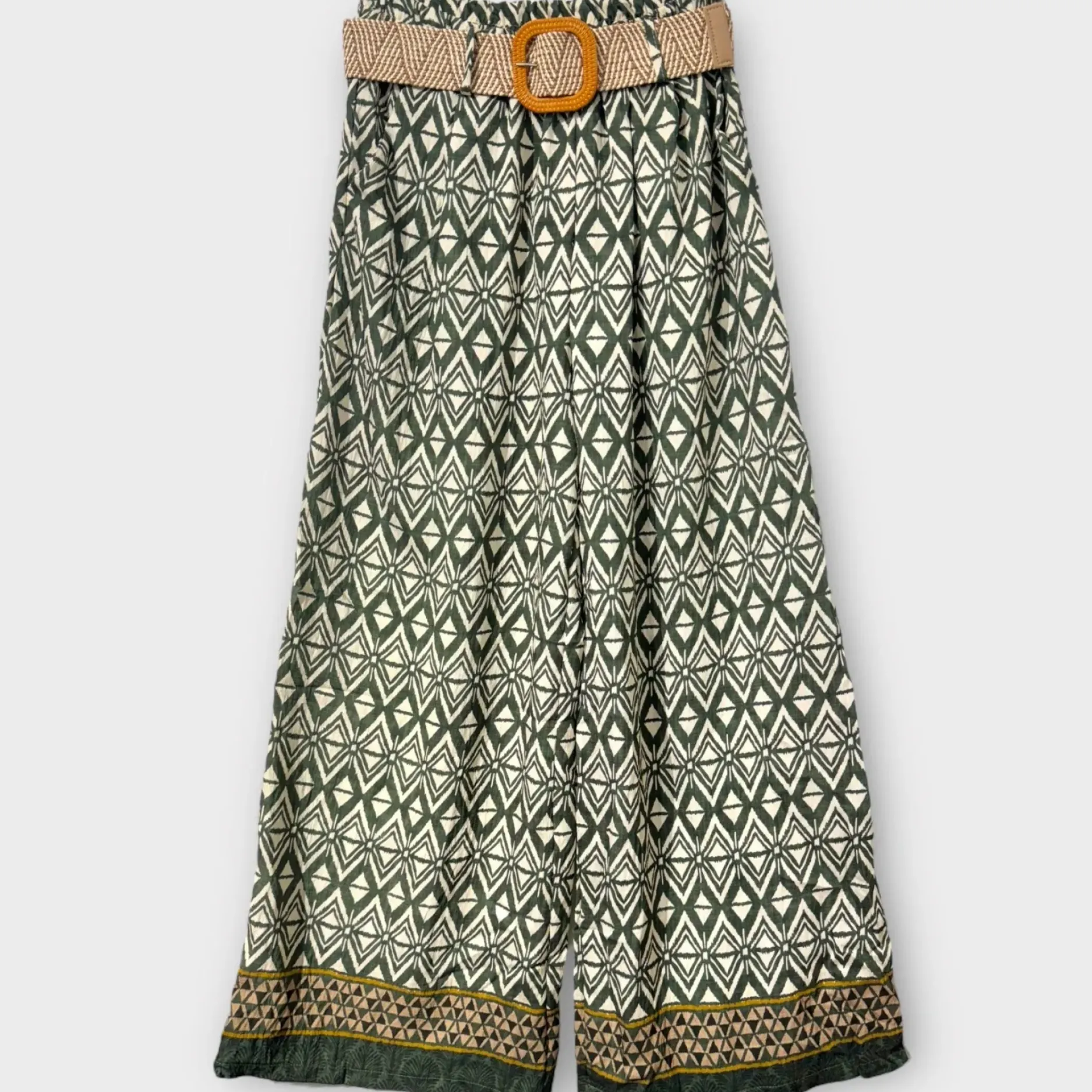 Découvrez le confort et l’élégance avec notre pantalon large fluide Thanais. Avec sa taille élastique et sa ceinture assortie en raphia, il s’adapte à toutes les tailles du 36 au 42. Son imprimé géométrique vert sapin ajoute une touche chic à votre tenue. Fabriqué en viscose et nylon pour un look luxueux et confortable.
