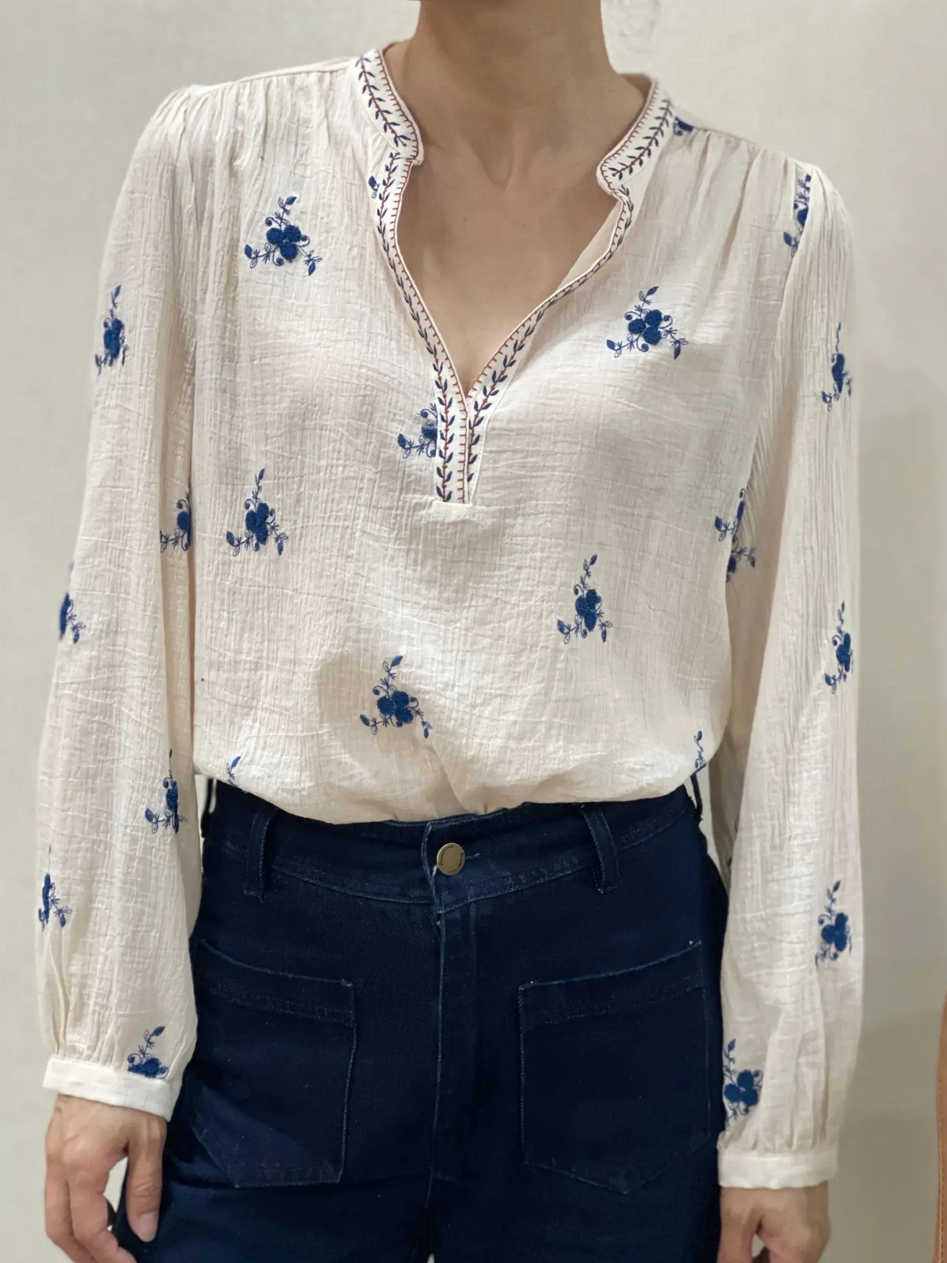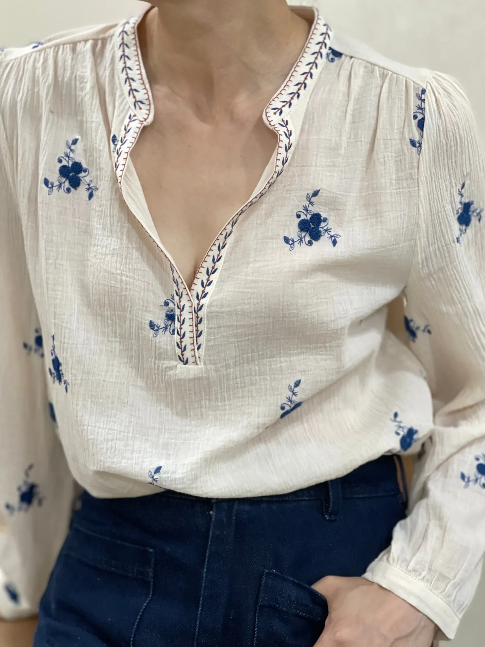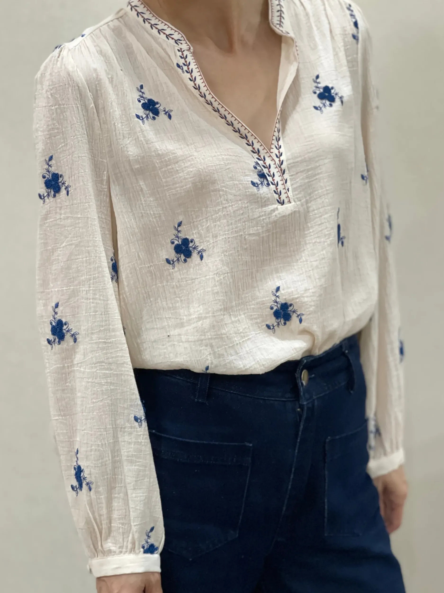 Faites ressortir votre style unique avec notre chemise Lila en coton écru crépé ornée d’un joli imprimé de petites fleurs bleues. Avec son col mao tendance et son encolure en V, vous serez élégante et confortable toute la journée. Disponible dans les tailles S à L.