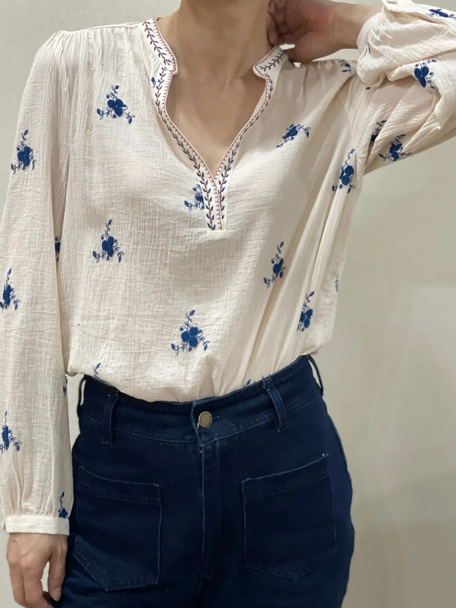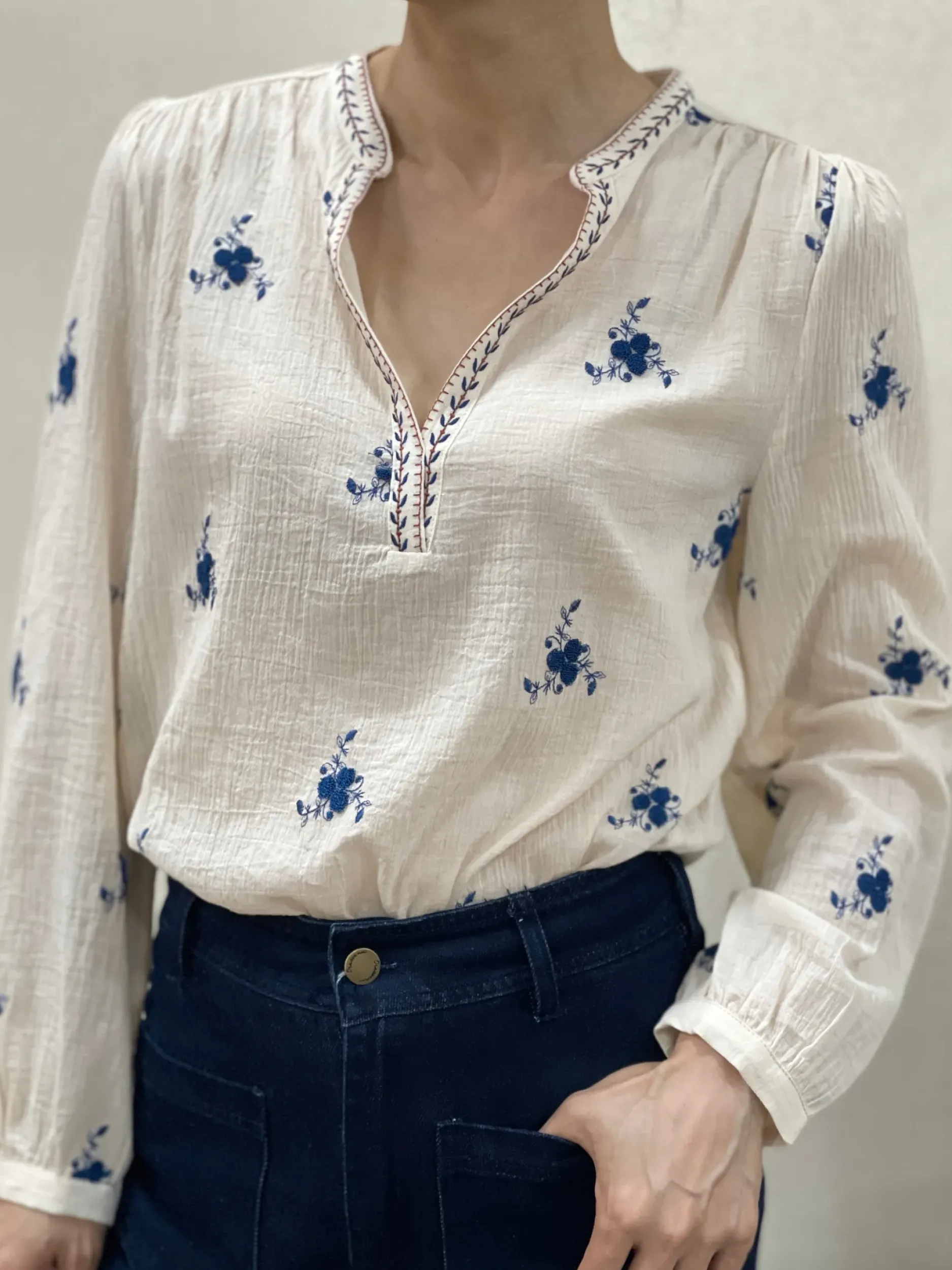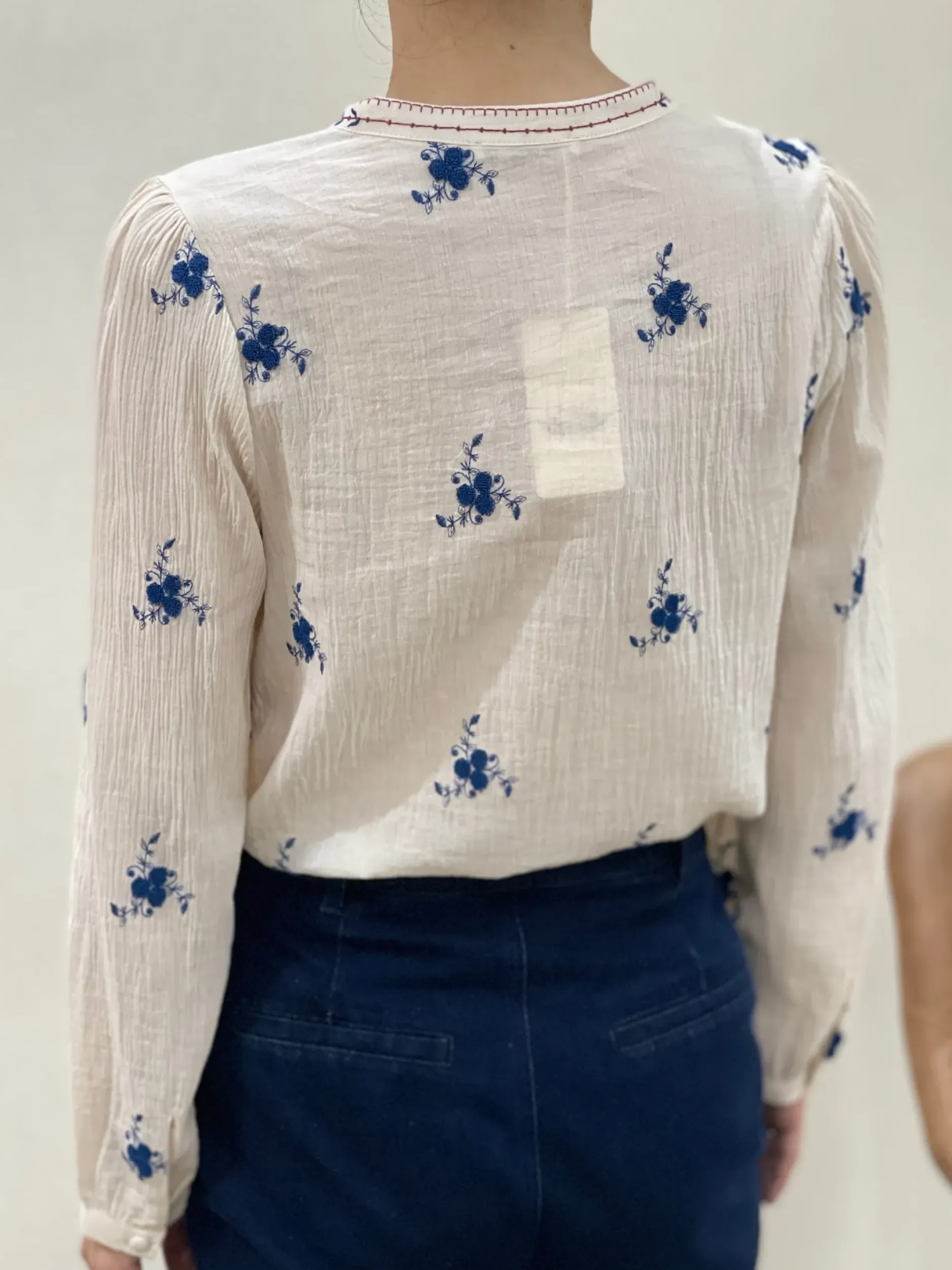 Faites ressortir votre style unique avec notre chemise Lila en coton écru crépé ornée d’un joli imprimé de petites fleurs bleues. Avec son col mao tendance et son encolure en V, vous serez élégante et confortable toute la journée. Disponible dans les tailles S à L.