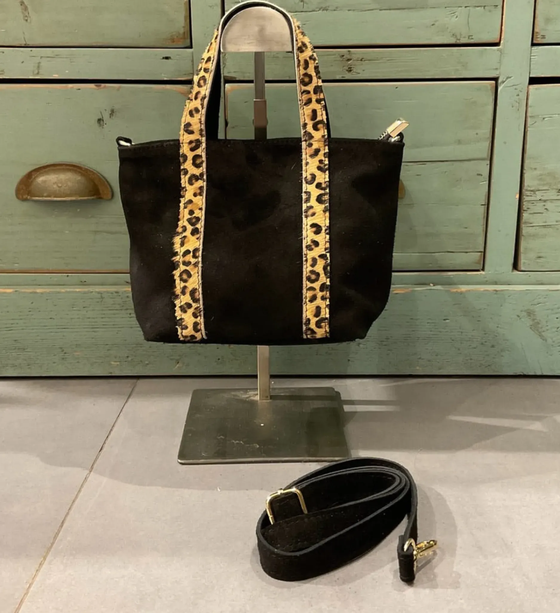 Ce sac en cuir, décliné en noir et en kaki, est l’accessoire parfait pour allier élégance et fonctionnalité. Orné de bandes à imprimé léopard, il offre une touche audacieuse et chic. Sa double poignée permet un porté main pratique, tandis que sa bandoulière amovible en cuir permet un porté épaule ou en travers pour plus de polyvalence. Compact mais spacieux, il est idéal pour contenir vos essentiels du quotidien tout en ajoutant une touche tendance à votre tenue.