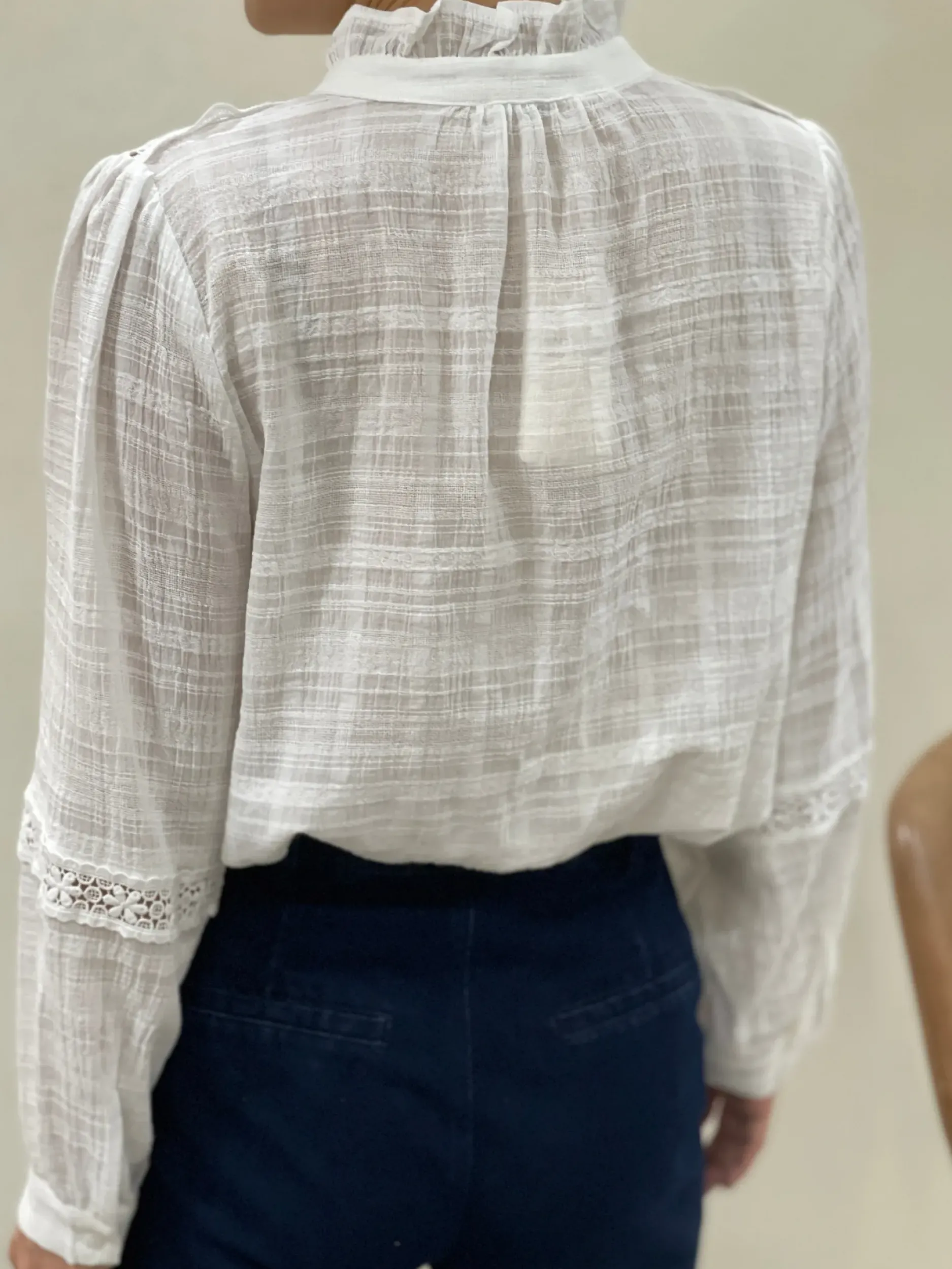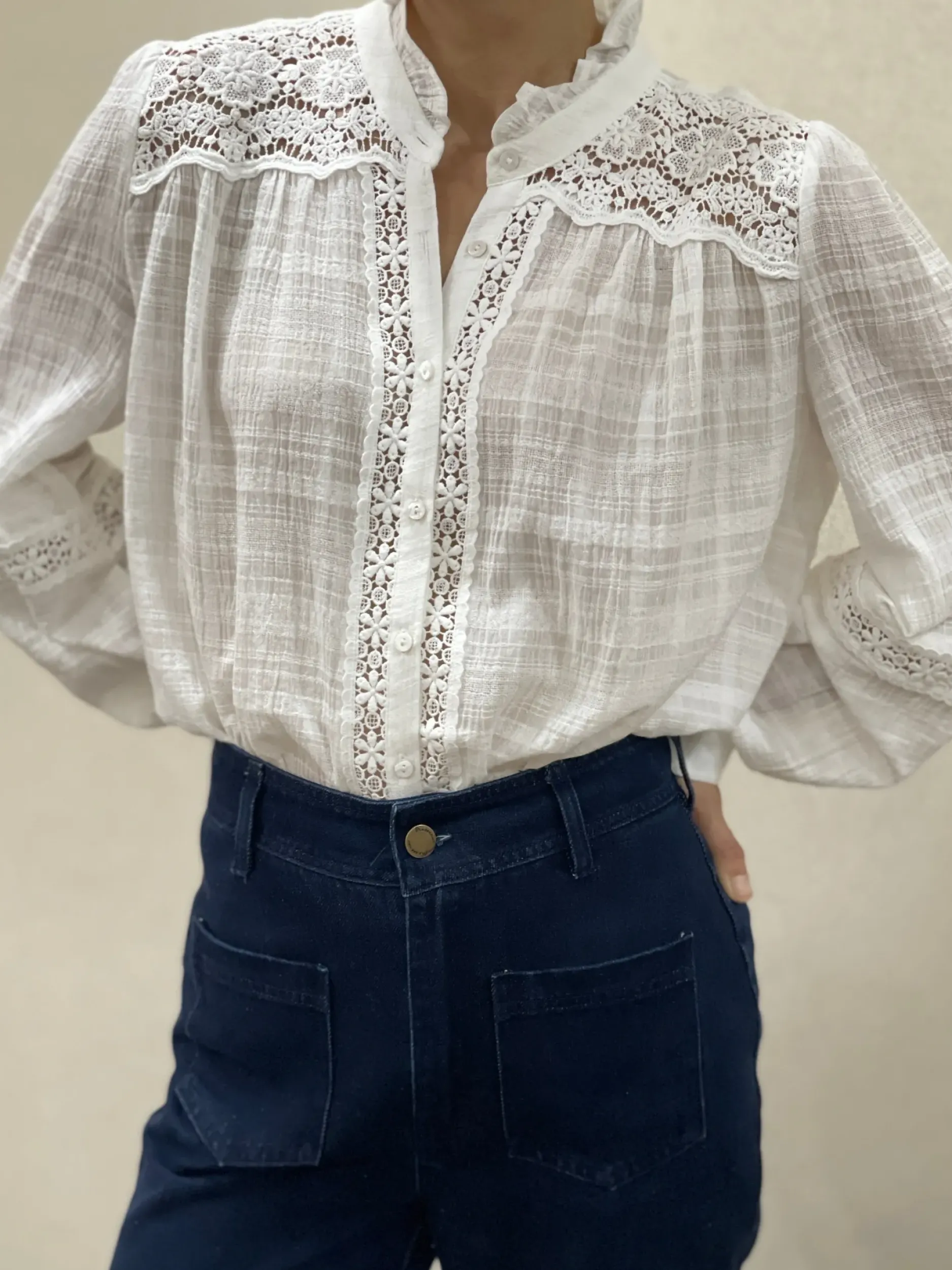 Apportez une touche romantique et bohème à votre dressing avec cette chemise en coton, délicatement ornée de dentelle ajourée. Sa coupe fluide et légère sublime toutes les silhouettes, du S au L, en offrant un confort optimal tout en restant élégante. Les détails en dentelle aux épaules, aux manches et sur la patte de boutonnage ajoutent une note raffinée et féminine à ce modèle intemporel. Parfaitement respirante grâce à sa composition en coton, cette chemise est idéale pour vous accompagner toute la journée, quelle que soit la saison.