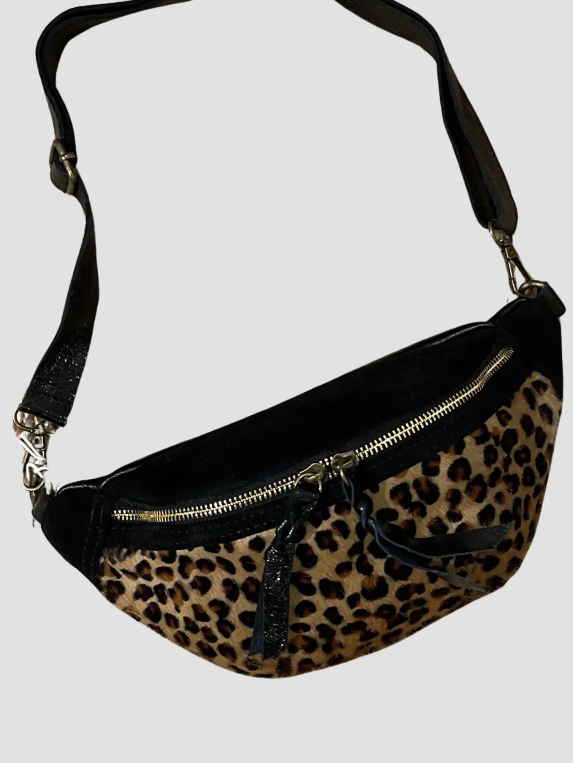 Emportez vos essentiels avec style grâce à la banane imprimé léopard en cuir de vachette italien. D’une hauteur de 13cm, d’une longueur de 28cm et d’une largeur de 8cm, elle vous offre suffisamment d’espace pour vos affaires tout en ajoutant une touche sauvage à votre tenue. Pratique et élégante, elle est parfaite pour toutes vos activités !