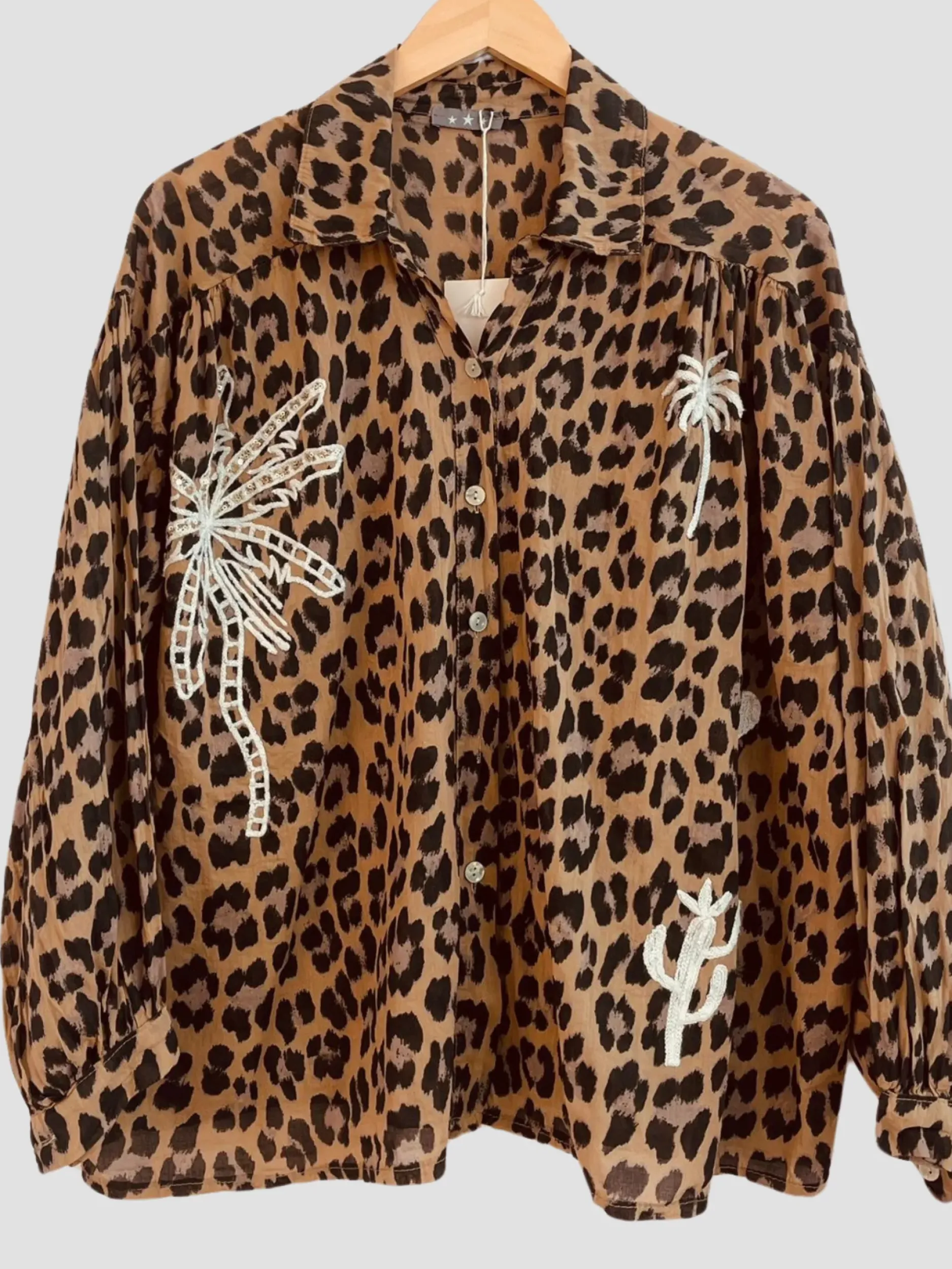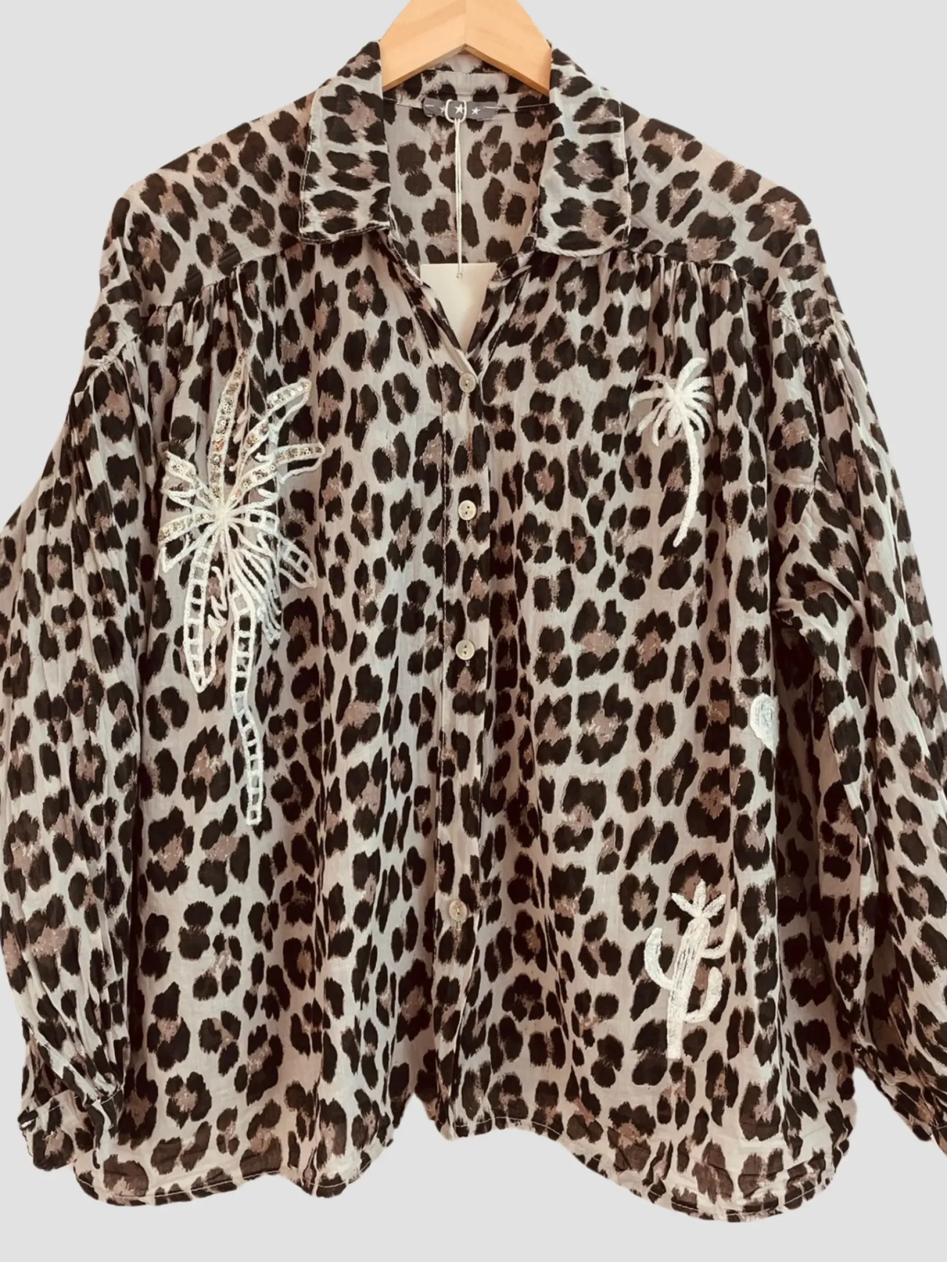 Découvrez notre Chemise Léo Palmier ! Ample, elle offre un look tendance grâce à son imprimé léopard et ses motifs palmiers en sequin. Avec son col chemise et son confort en coton, elle convient à toutes les tailles (36-46). Ajoutez une touche de style et de confort à votre garde-robe avec cette chemise unique !