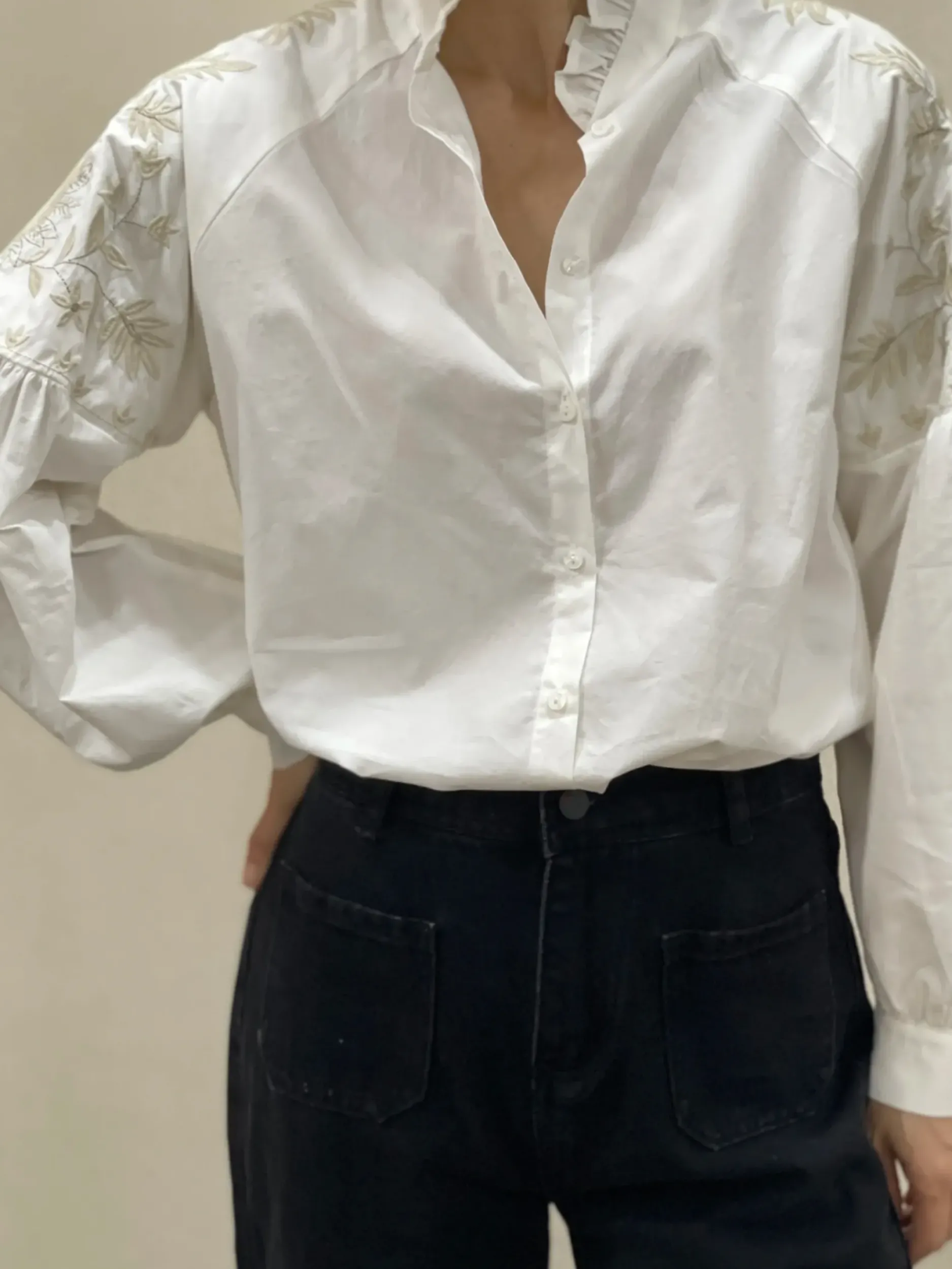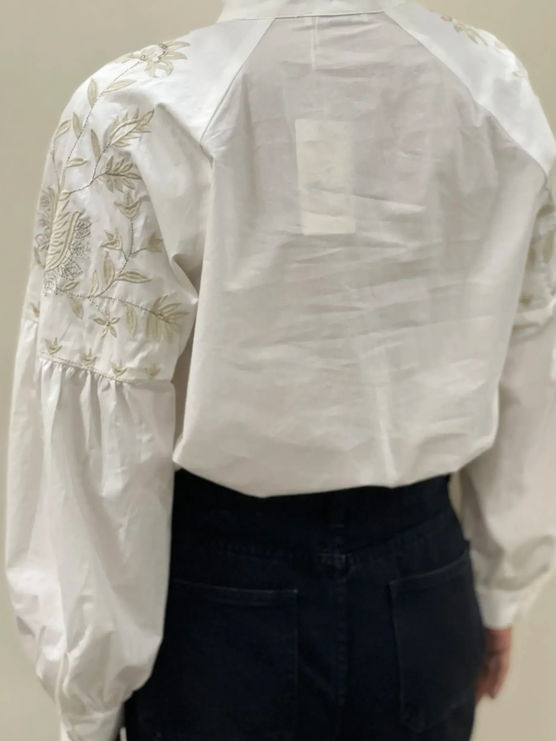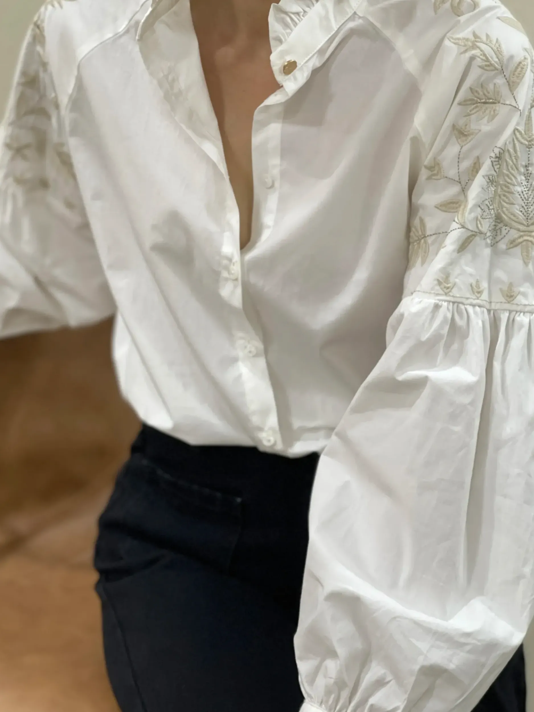 Cette chemise écru raffinée est sublimée par des détails délicats de broderie dorée sur les manches, offrant une touche d’élégance et de féminité à votre tenue. Ses boutons dorés sur les manches et le col ajoutent une note chic et sophistiquée, parfaite pour les occasions spéciales ou pour apporter du glamour à vos looks quotidiens. Fabriquée en 100% coton, elle est à la fois douce et respirante, idéale pour un confort optimal.