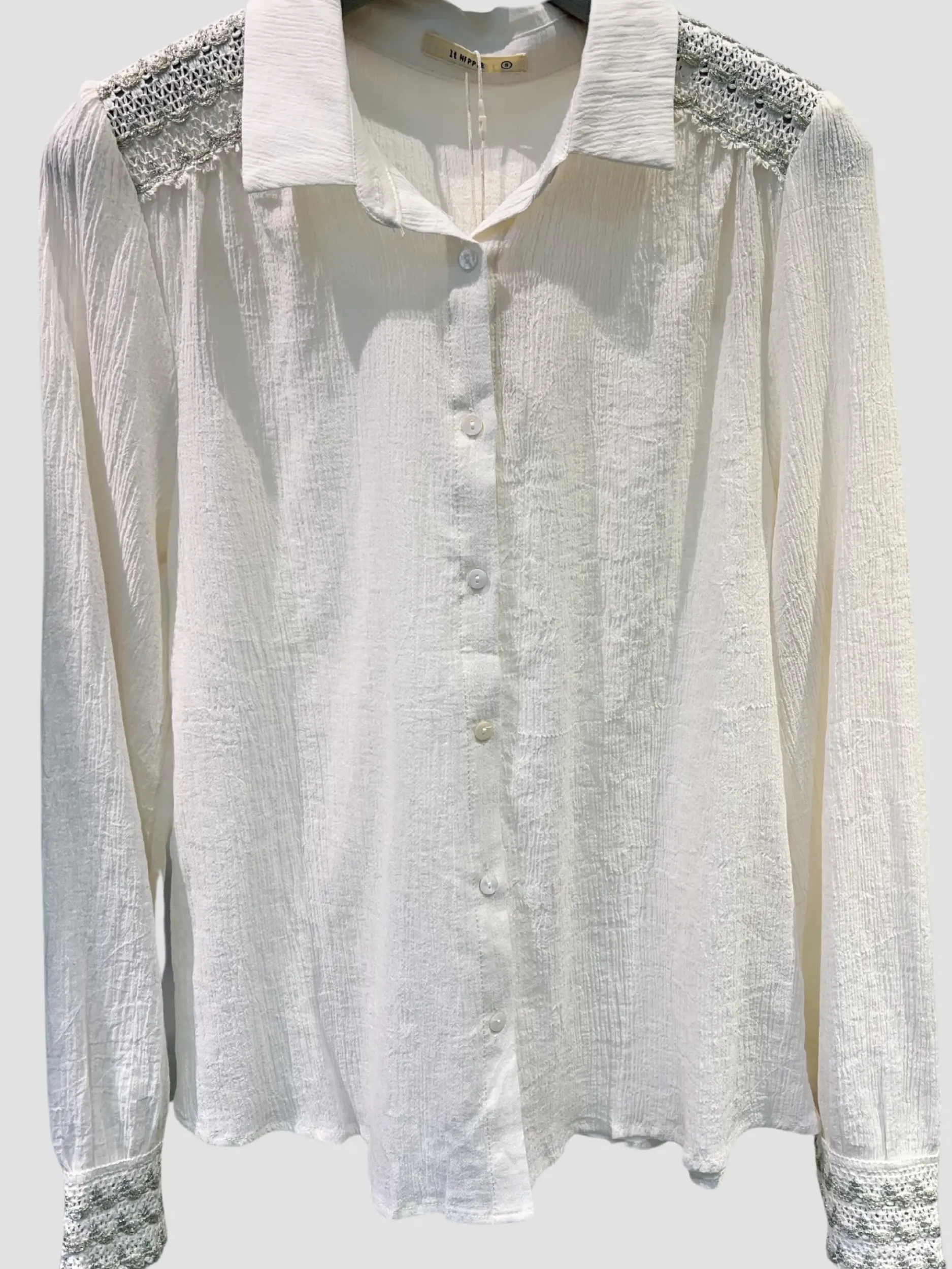 Découvrez notre chemise Nelly en coton crêpé écru ! Avec ses manches longues et son col chemise, elle vous apporte confort et élégance. Les broderies sur les épaules et les poignets ajoutent une touche originale. Disponible en tailles S à L. Ajoutez-la à votre garde-robe dès maintenant !