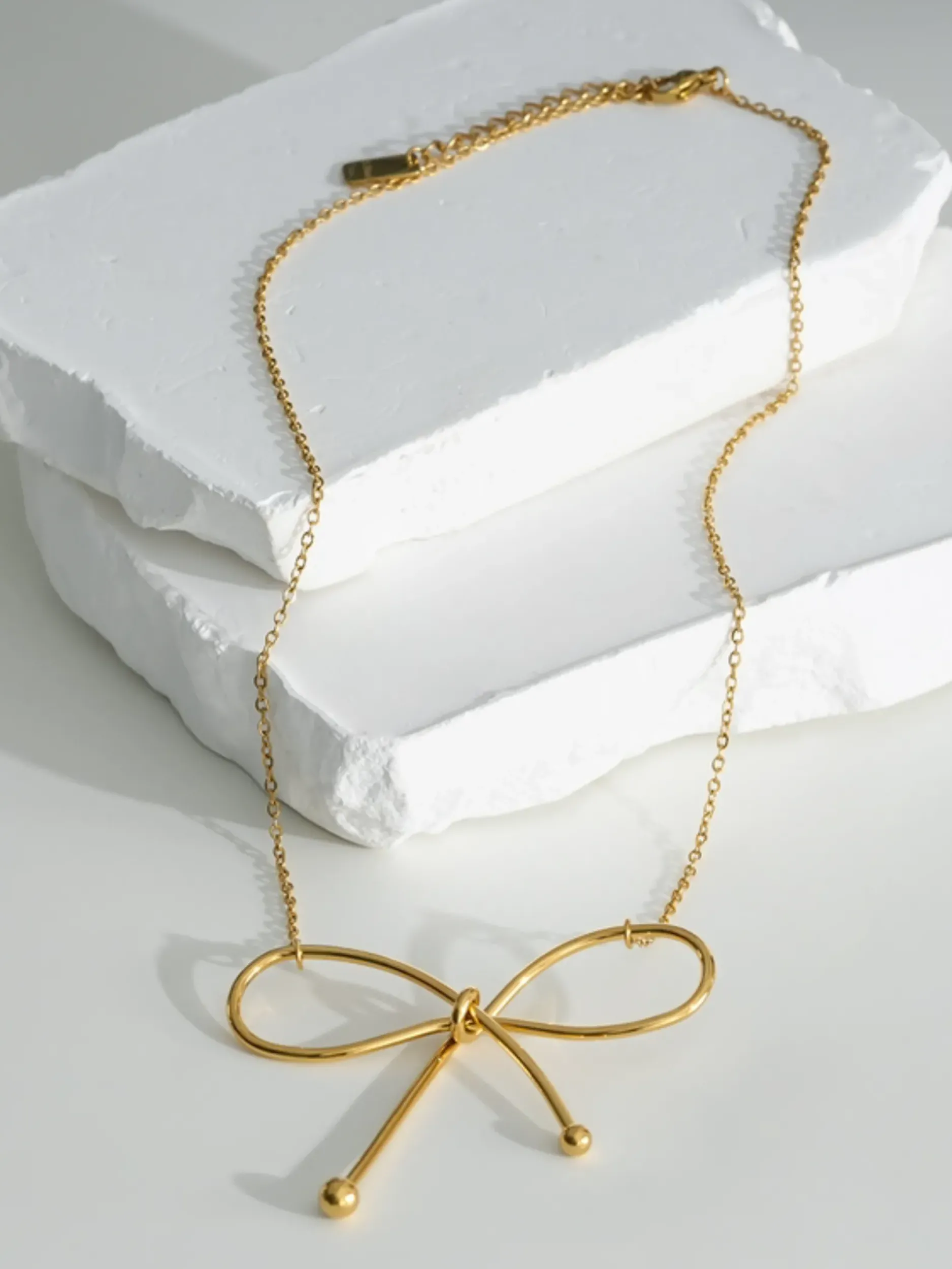Sublimez votre tenue avec ce magnifique collier nœud en acier inoxydable doré. Son design fin et élégant apportera une touche de raffinement à votre look. L’accessoire parfait pour toute occasion !