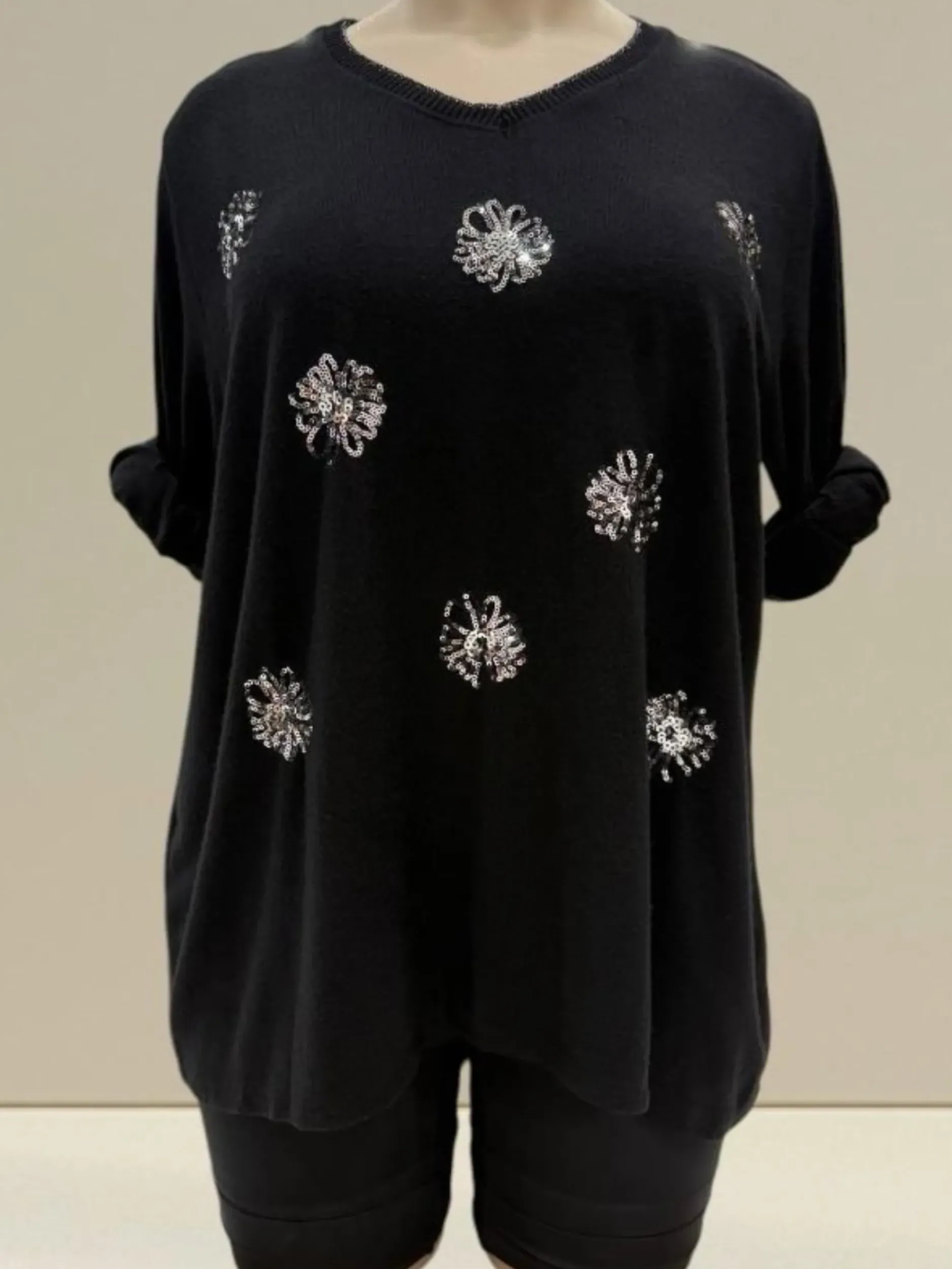 Découvrez notre pull ample en viscose et élasthanne orné de fleurs en sequins brodés, pour un look élégant et unique. Avec son col en V et ses manches longues, il s’adapte à toutes les tailles du 44 au 50. Ajoutez une touche de brillance et de style à votre garde-robe avec ce pull moderne et confortable.