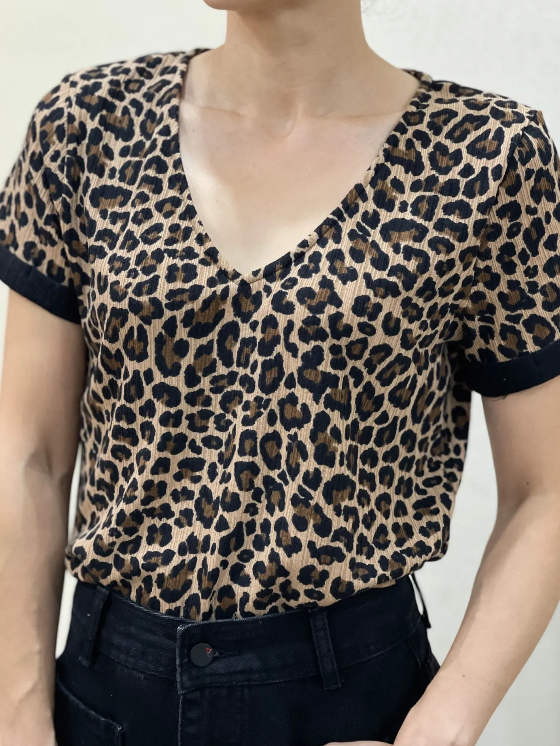 Découvrez notre Tee-shirt Léopard Revers! Avec ses manches courtes, son encolure en V et son imprimé léopard, ce tee-shirt vous apportera une touche de style sauvage. Fabriqué en polyester et élasthanne, il offre un confort et une coupe parfaite. Disponible en tailles S à L.
