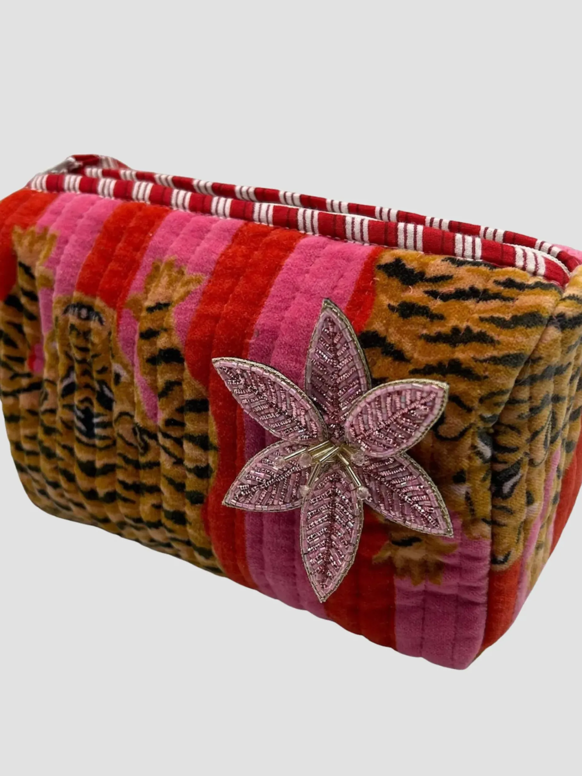 Cette superbe trousse de maquillage en velours matelassé arbore un imprimé tropical. Veuillez noter que la position d’impression peut varier d’un sac à l’autre. Cette trousse de maquillage est livrée avec une broche amovible en forme de fleur de lotus perlée. Fabriqué en Inde Grandes mesures : 21 cm de largeur/15 cm de hauteur/9 cm de profondeur