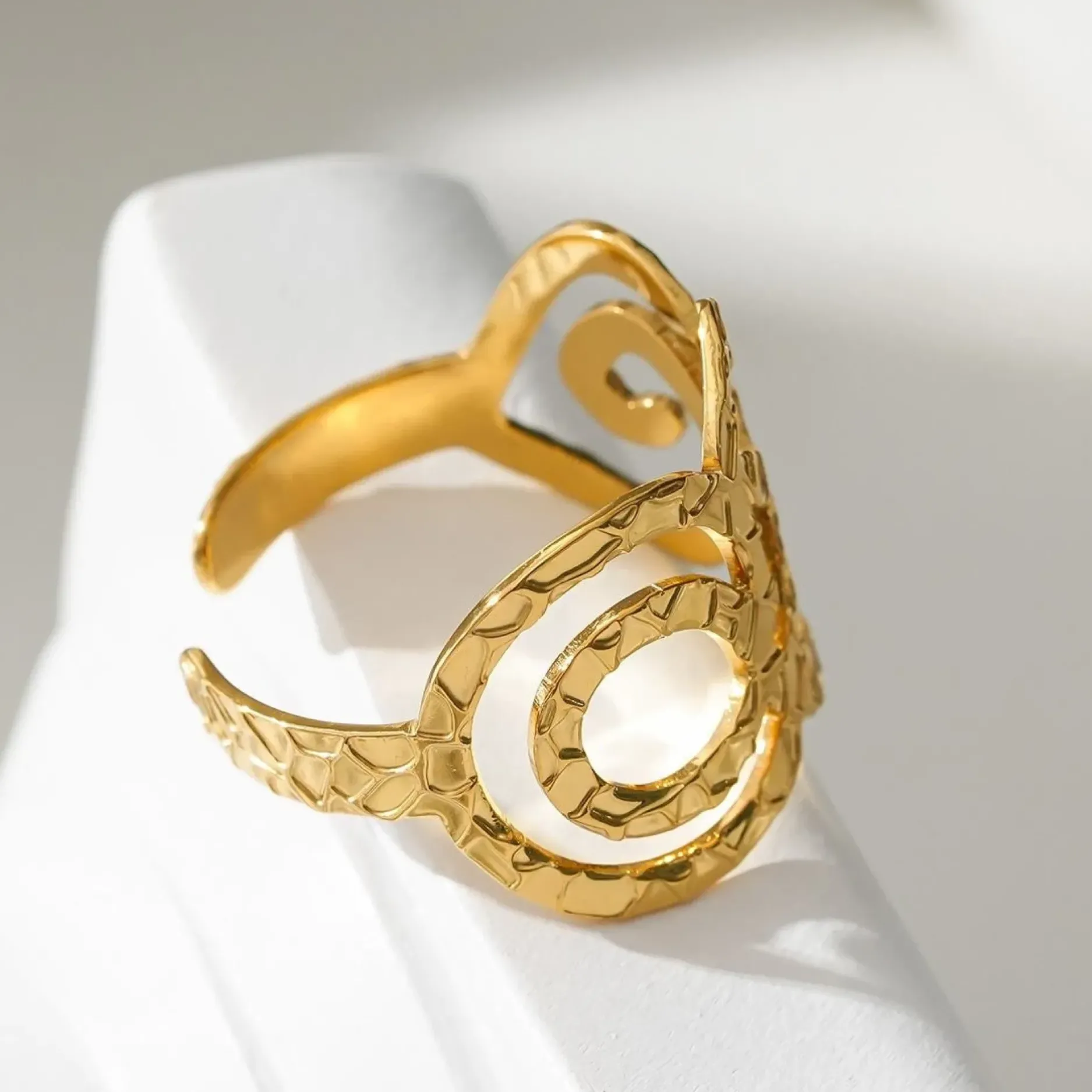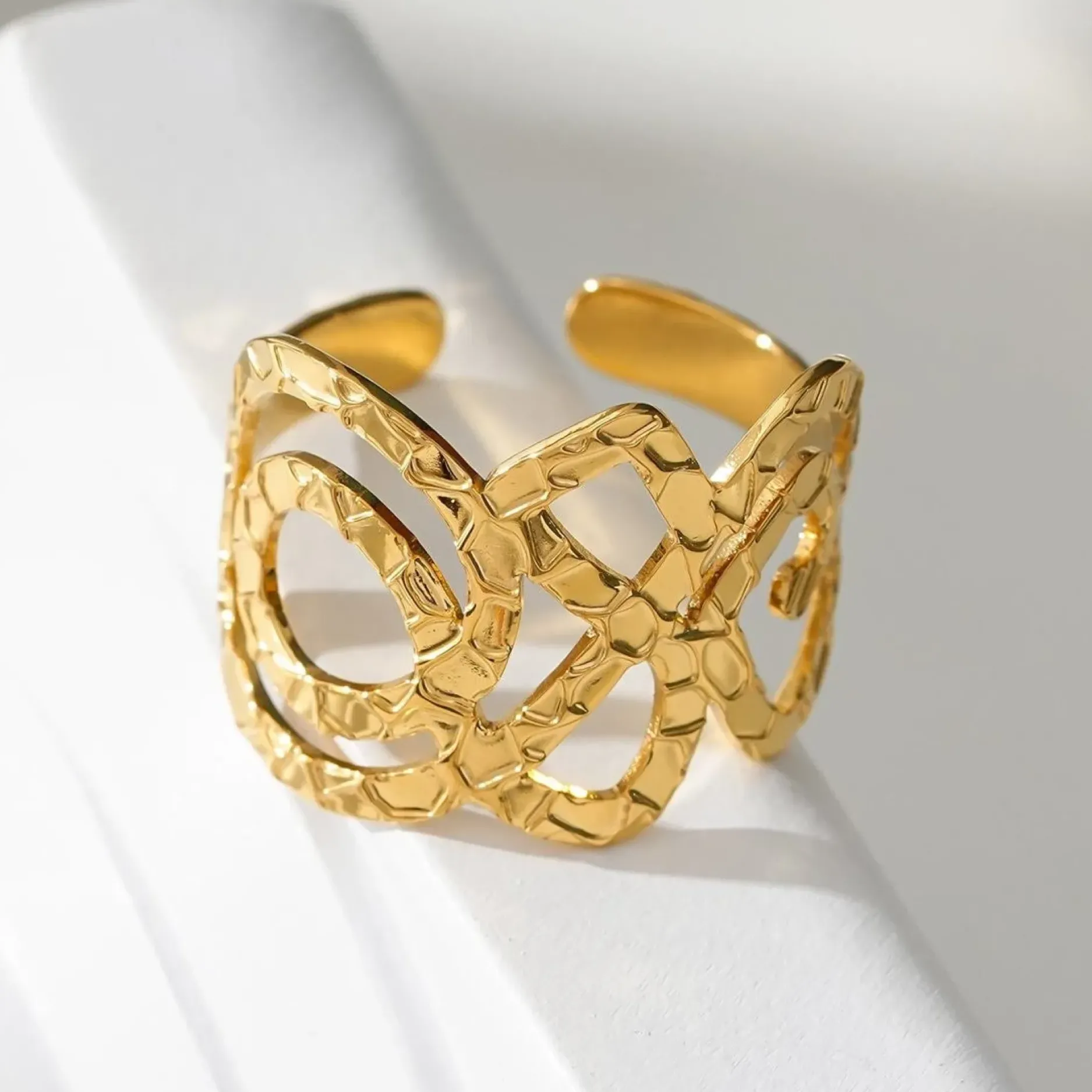 Cette bague dorée martelée ajourée, fabriquée en acier inoxydable, se distingue par son design original et sa texture unique. Le motif martelé apporte un effet visuel raffiné et lumineux, tandis que l’ajourage crée une sensation de légèreté et d’élégance. La finition dorée met en valeur la structure de la bague, ajoutant un éclat subtil à votre look tout en restant moderne et intemporel.