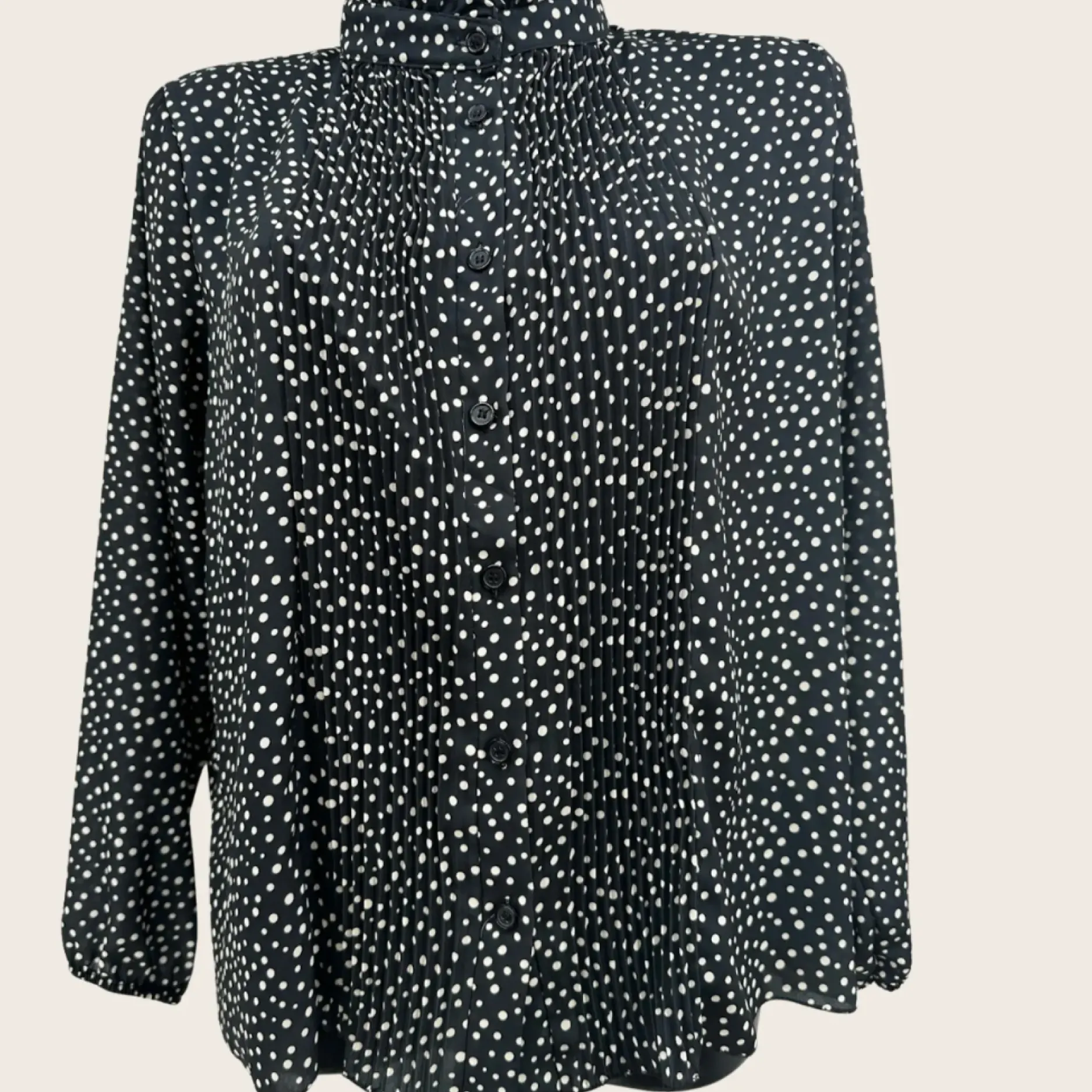 Apportez une touche d’originalité à votre garde-robe avec cette chemise fluide à motif petits pois. Le col montant avec froufrou et les manches longues apportent une touche féminine, tandis que la fermeture boutons et l’effet plissé ajoutent du style. En 100% polyester et taille unique du 36 au 42, disponible en noir et en marine.