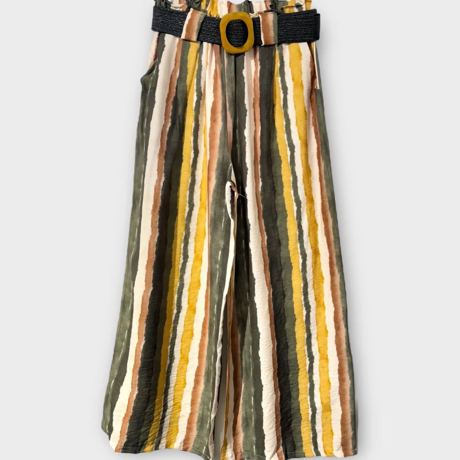 Découvrez le confort et le style du Pantalon Mora ! Avec son motif géométrique coloré et sa taille élastique, il s’adapte à toutes les tailles (du 36 au 44). La ceinture en raphia incluse ajoute une touche bohème à ce pantalon ample, conçu en 85% Viscose et 15% Nylon. Profitez d’un look unique et tendance avec le Pantalon Mora !