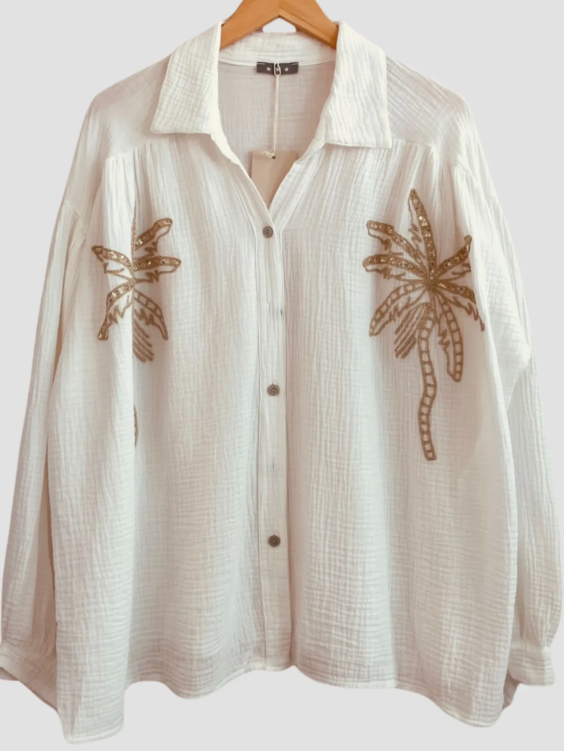 Découvrez notre chemise Gaze de Coton Palmier, en coton doux et léger. La coupe ample s’adapte à toutes les tailles (du 36 au 44), tandis que le motif palmier en sequin ajoute une touche d’élégance à votre tenue. Profitez du confort et du style avec cette chemise blanche, parfaite pour toutes les occasions.
