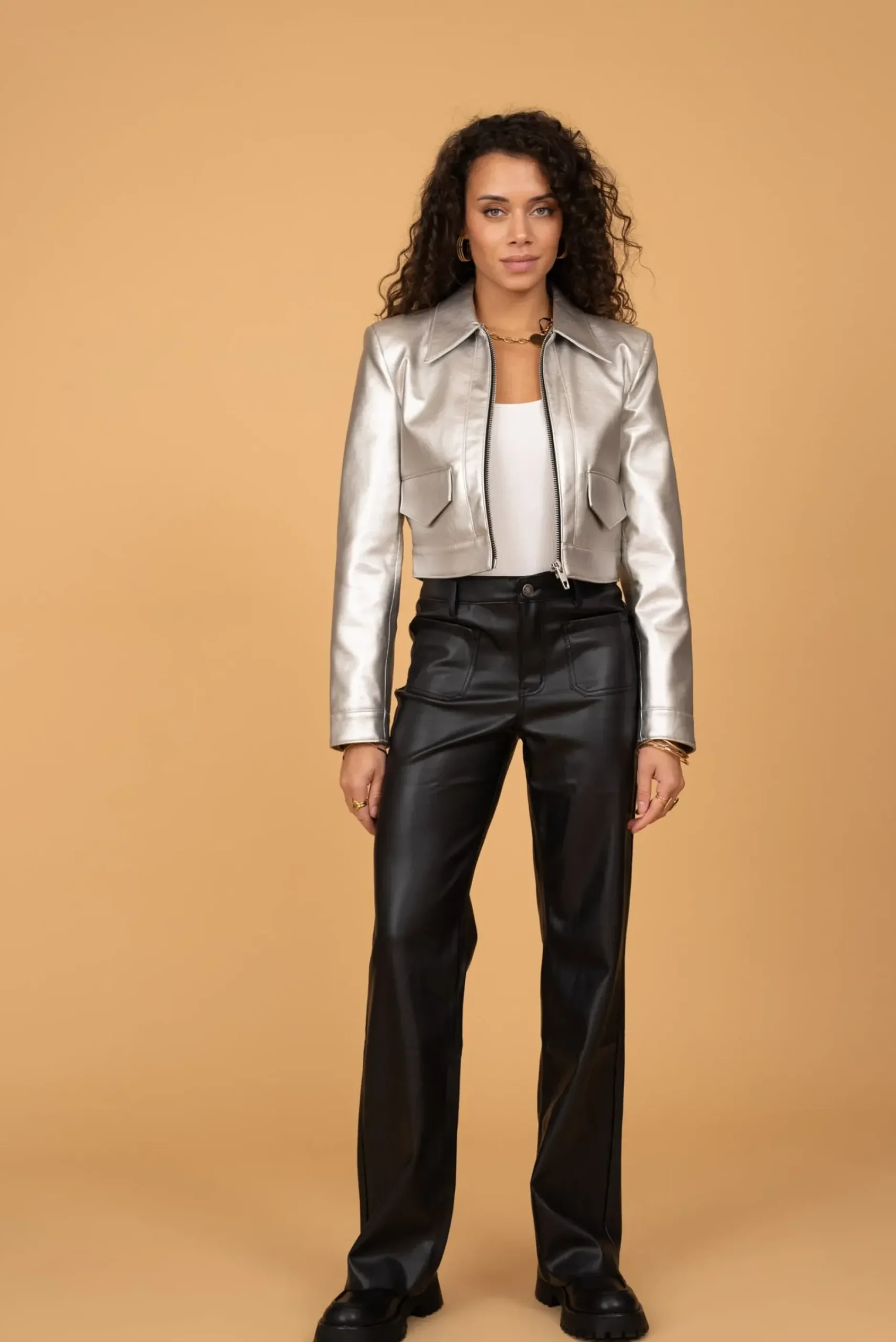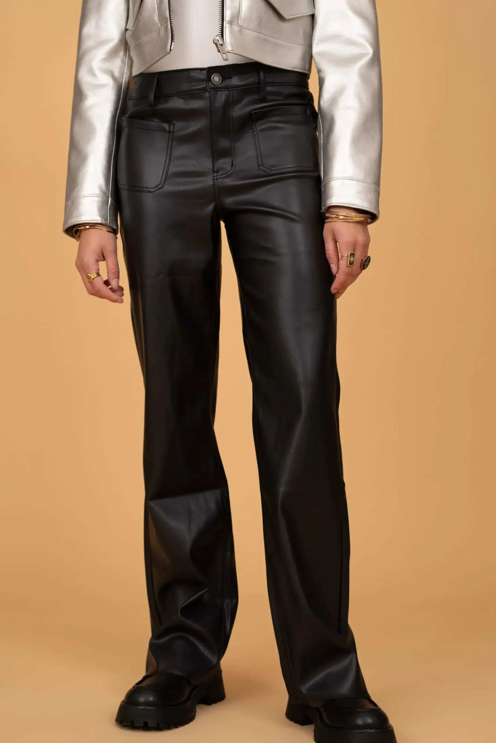 Ce pantalon wide leg en simili cuir noir est un essentiel chic et moderne pour toutes les femmes audacieuses et élégantes. Conçu dans un mélange de 55% Sea Island Fiber et 45% polyuréthane, il allie confort et durabilité tout en offrant une texture et un aspect cuir authentique. Sa coupe ample et fluide, avec des jambes larges, apporte une touche sophistiquée à la silhouette, tout en restant confortable et agréable à porter. Disponible du 34 au 42, il convient à différentes morphologies en s’adaptant parfaitement aux courbes.