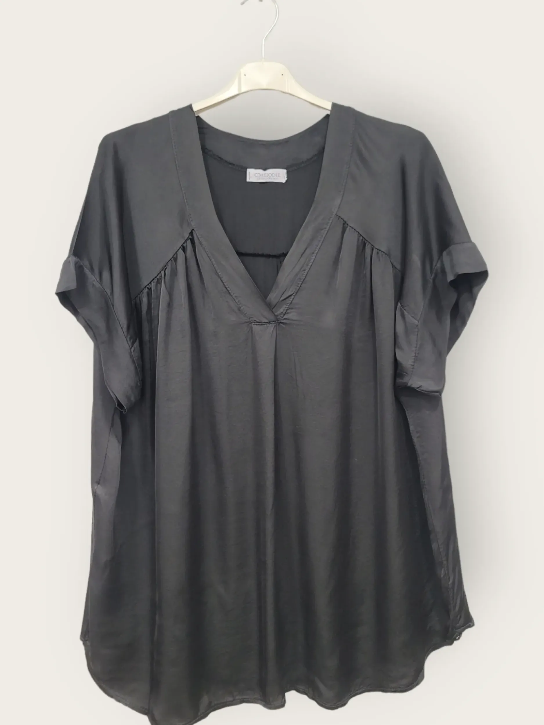 Découvrez notre top satiné uni, en viscose fluide et ample, avec une encolure en V et des manches courtes. Disponible en noir et en kaki, en taille unique du 44 au 50. Ajoutez une touche de luxe à votre garde-robe avec ce haut polyvalent. Soyez élégant et à l’aise avec le top satiné que vous pouvez porter pour toutes les occasions.