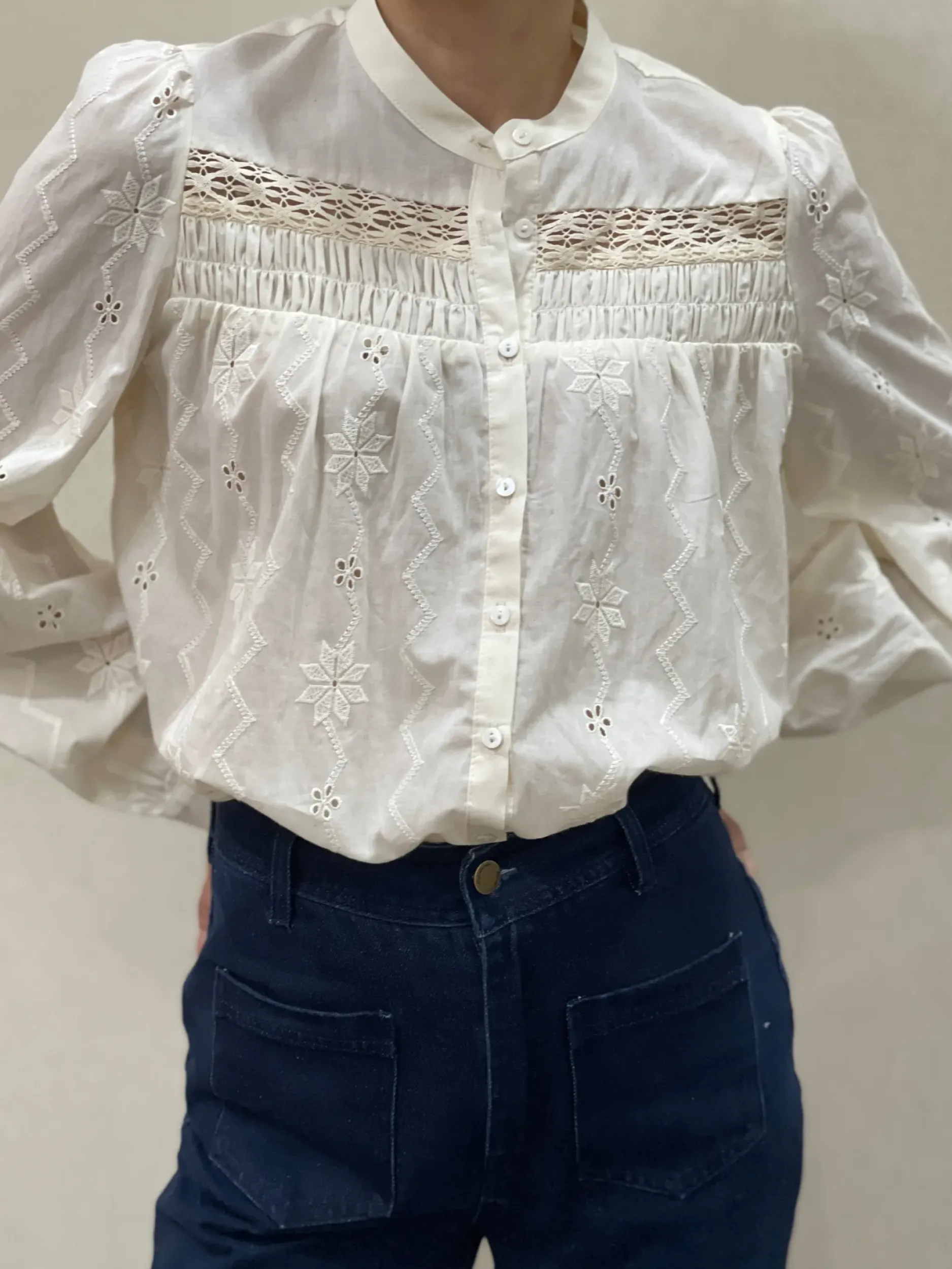 Laissez-vous séduire par l’élégance intemporelle de cette chemise écrue brodée avec des détails en dentelle raffinée. Confectionnée en 100% coton, elle offre un confort exceptionnel tout en sublimant votre silhouette. Son col mao apporte une touche moderne et sophistiquée, tandis que les broderies délicates et la dentelle ajoutent une note féminine et romantique. Disponible en tailles S, M et L, cette chemise est parfaite pour un look chic et élégant en toutes occasions.