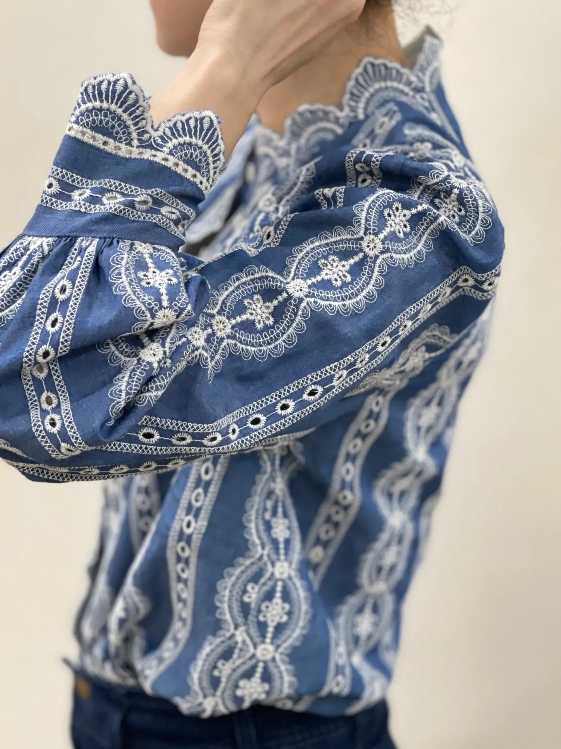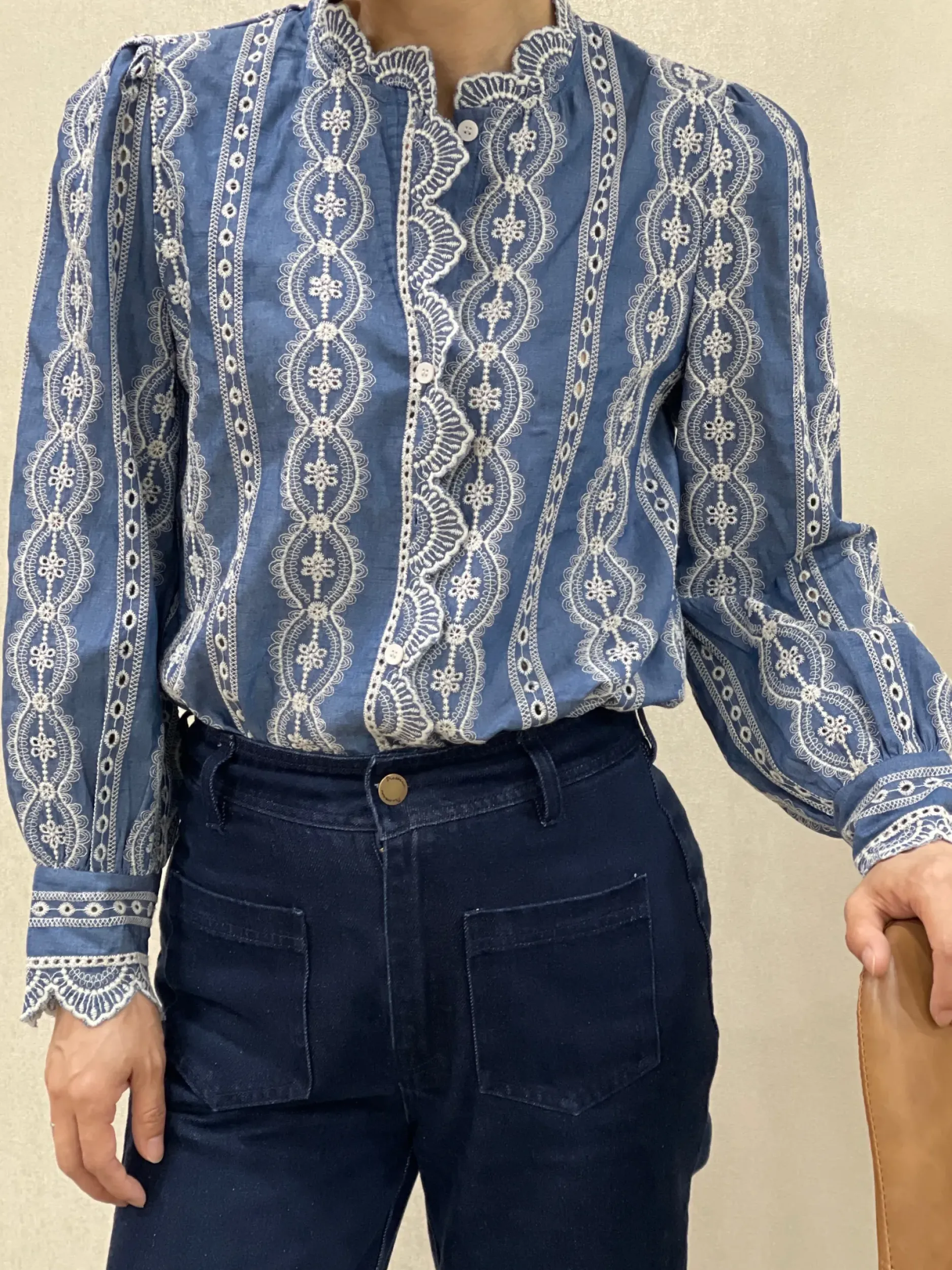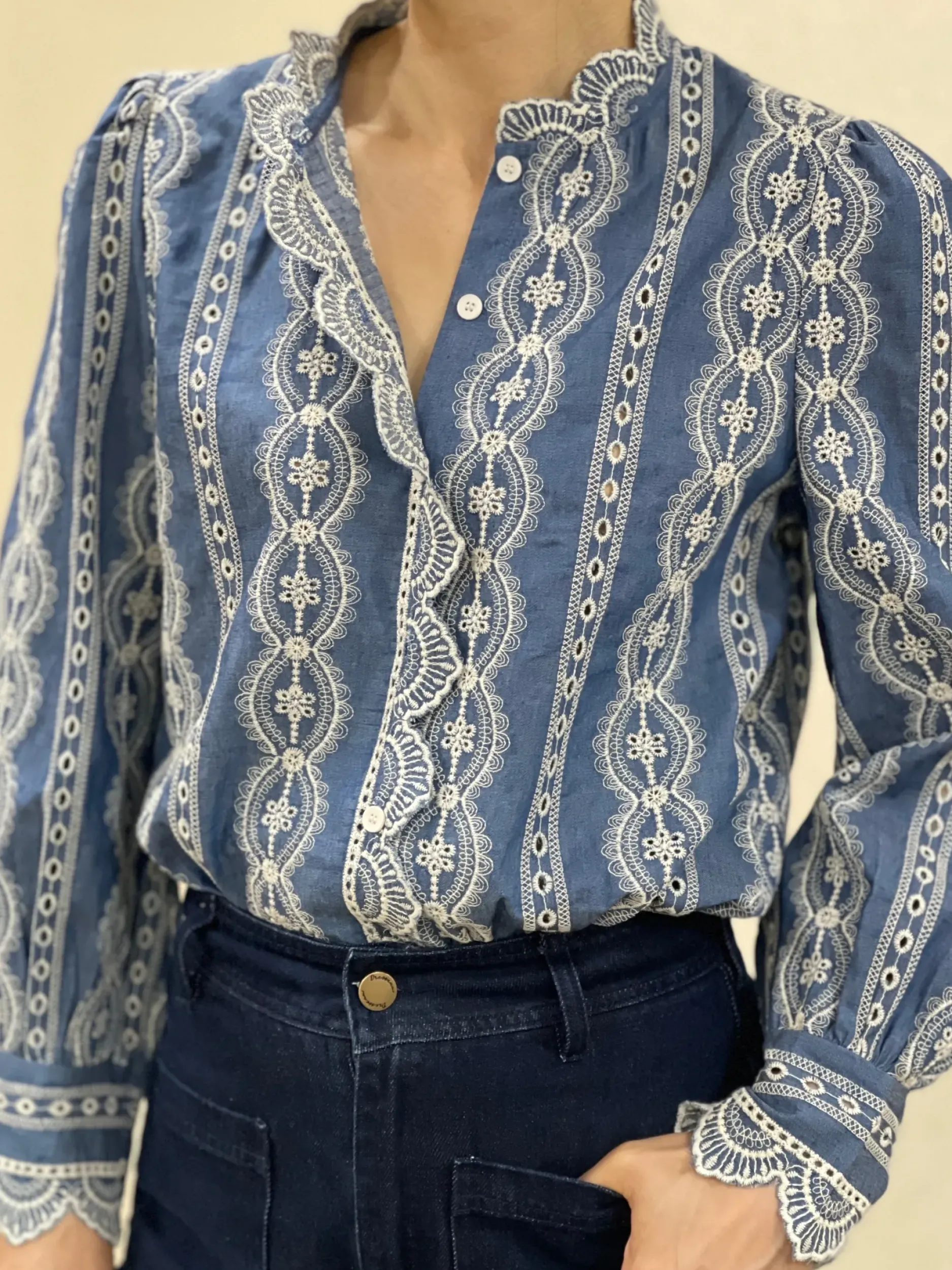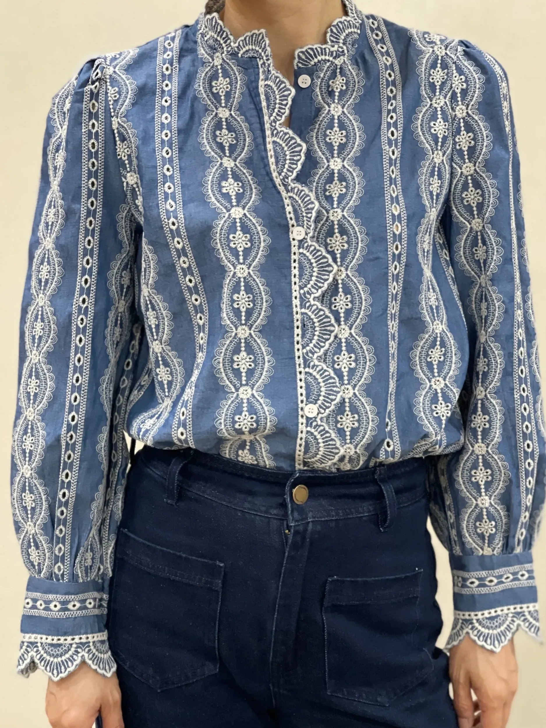 Découvrez notre magnifique chemise en coton brodée Jana! Son design unique en bleu et écru ajoutera une touche d’élégance à votre tenue. Avec ses manches longues et son col légèrement montant orné de broderie, vous serez à la pointe de la mode. Disponible en tailles S à L.