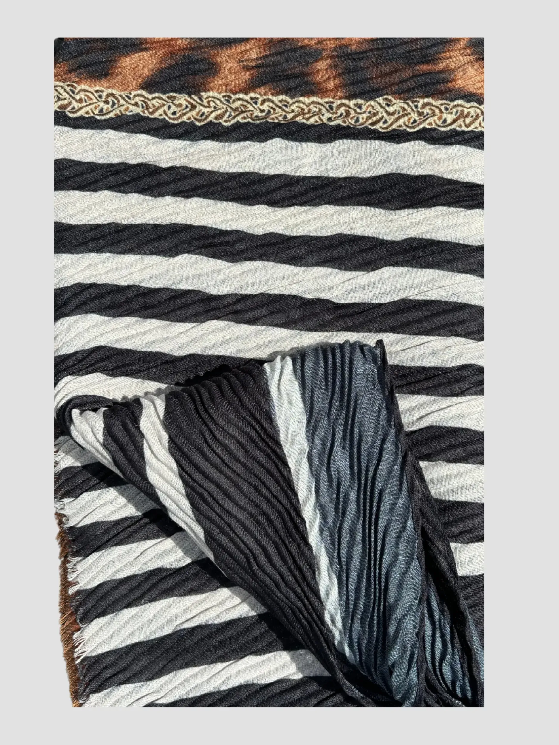 Découvrez le Foulard Froncé Léopard! Avec son imprimé léopard sur un fond rayé, ce foulard ajoutera une touche de style à toutes vos tenues. Fabriqué en 80% viscose et 20% coton, il offre un mélange parfait de confort et de légèreté. Parfait pour un look sauvage et élégant !
