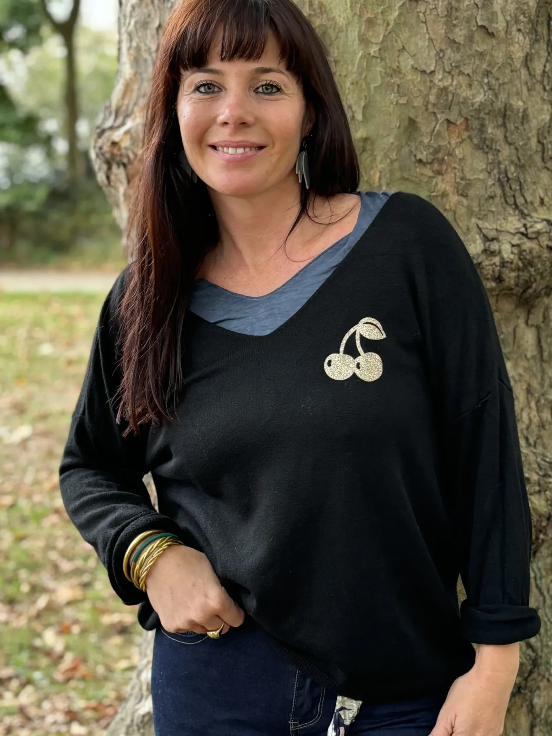 Ce Pull Mini Cherry vous gardera au chaud grâce à ses manches longues et son encolure en V. Sa petite cerise dorée sur la poitrine apportera une touche de fantaisie à votre tenue. Avec sa taille unique, elle s’adaptera à toutes les morphologies du 36 au 44. Fabriqué à partir de 50% viscose, 28% polyester et 22% polyamide, ce pull offre un confort optimal tout en étant tendance.