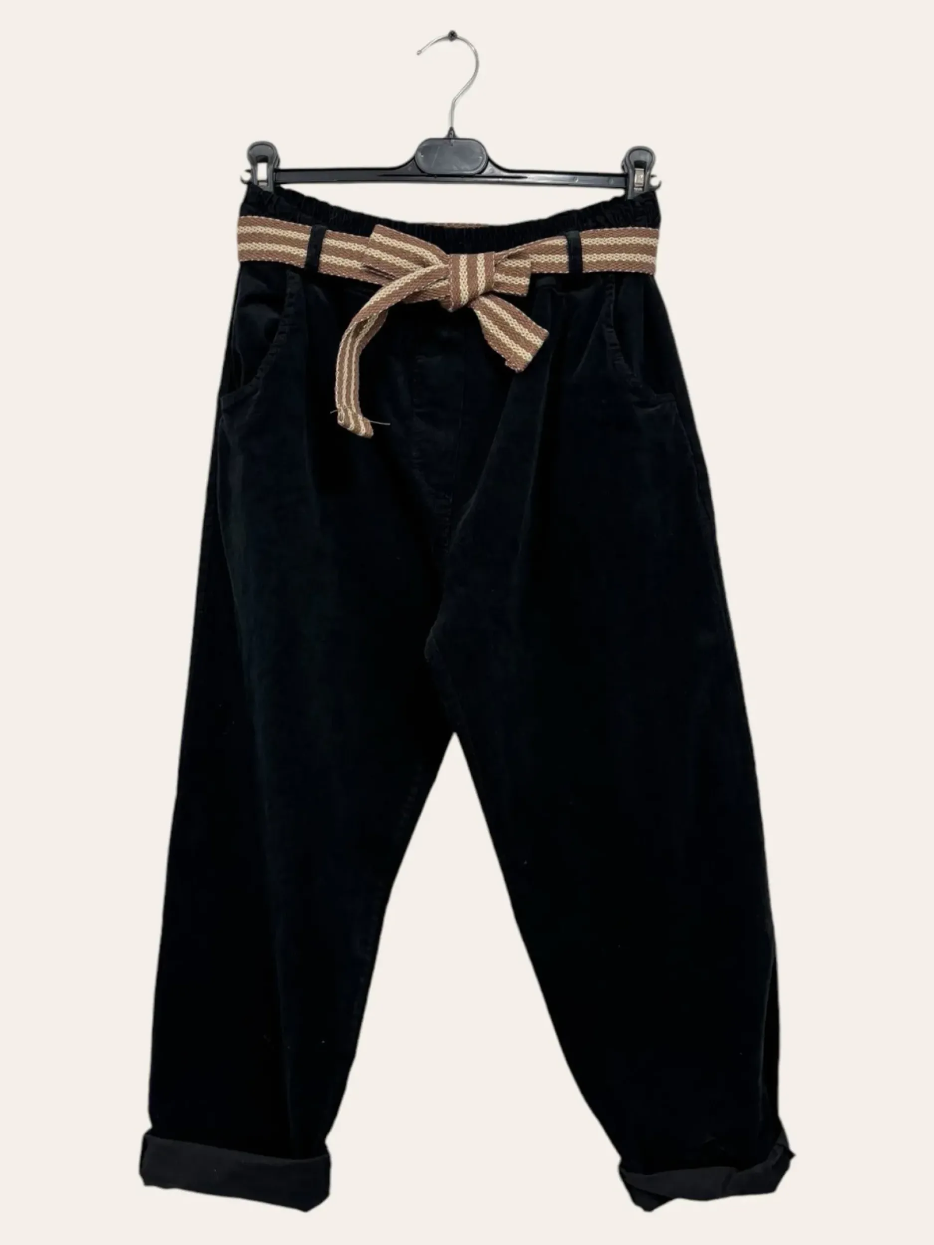 Ces pantalons en velours uni sont à la fois confortables et élégants. Avec leur ceinture à nouer incluse et leur taille élastique, ils s’adaptent parfaitement à toutes les tailles du 44 au 48. Disponibles en différentes couleurs, ces pantalons offrent également deux poches latérales pratiques. Fabriqués à 100% en coton, ils vous garantissent un confort optimal tout en ajoutant une touche de style à votre tenue.