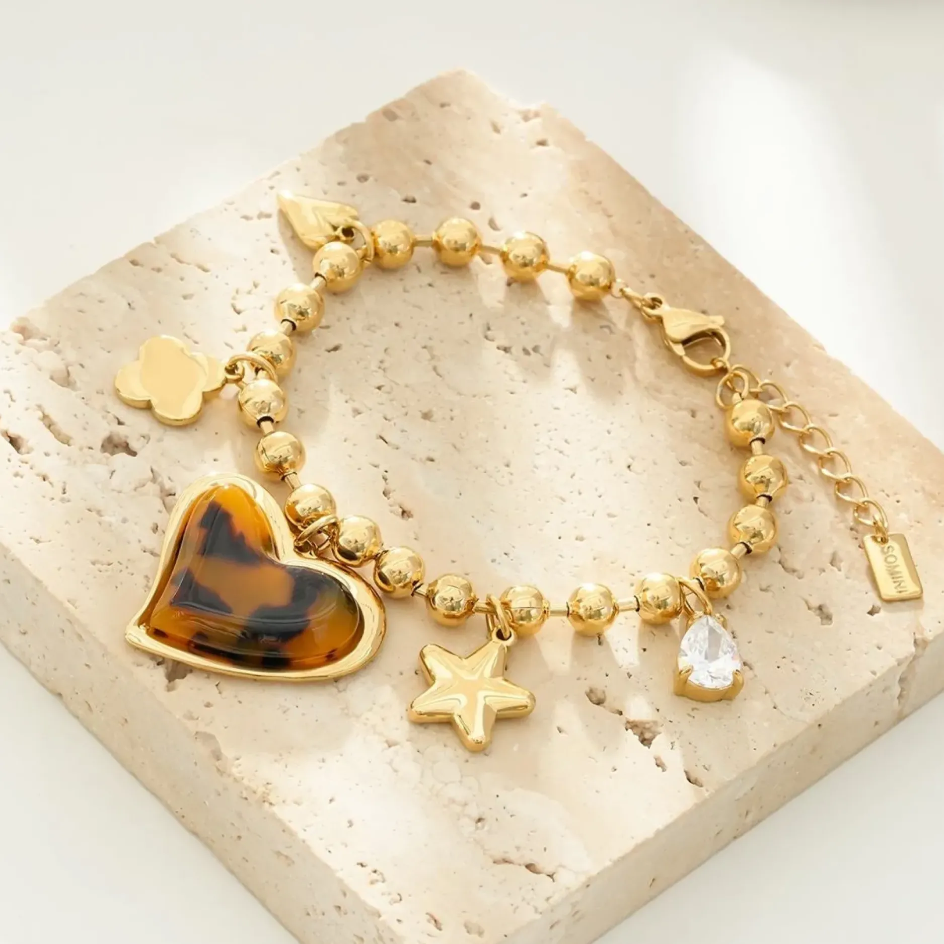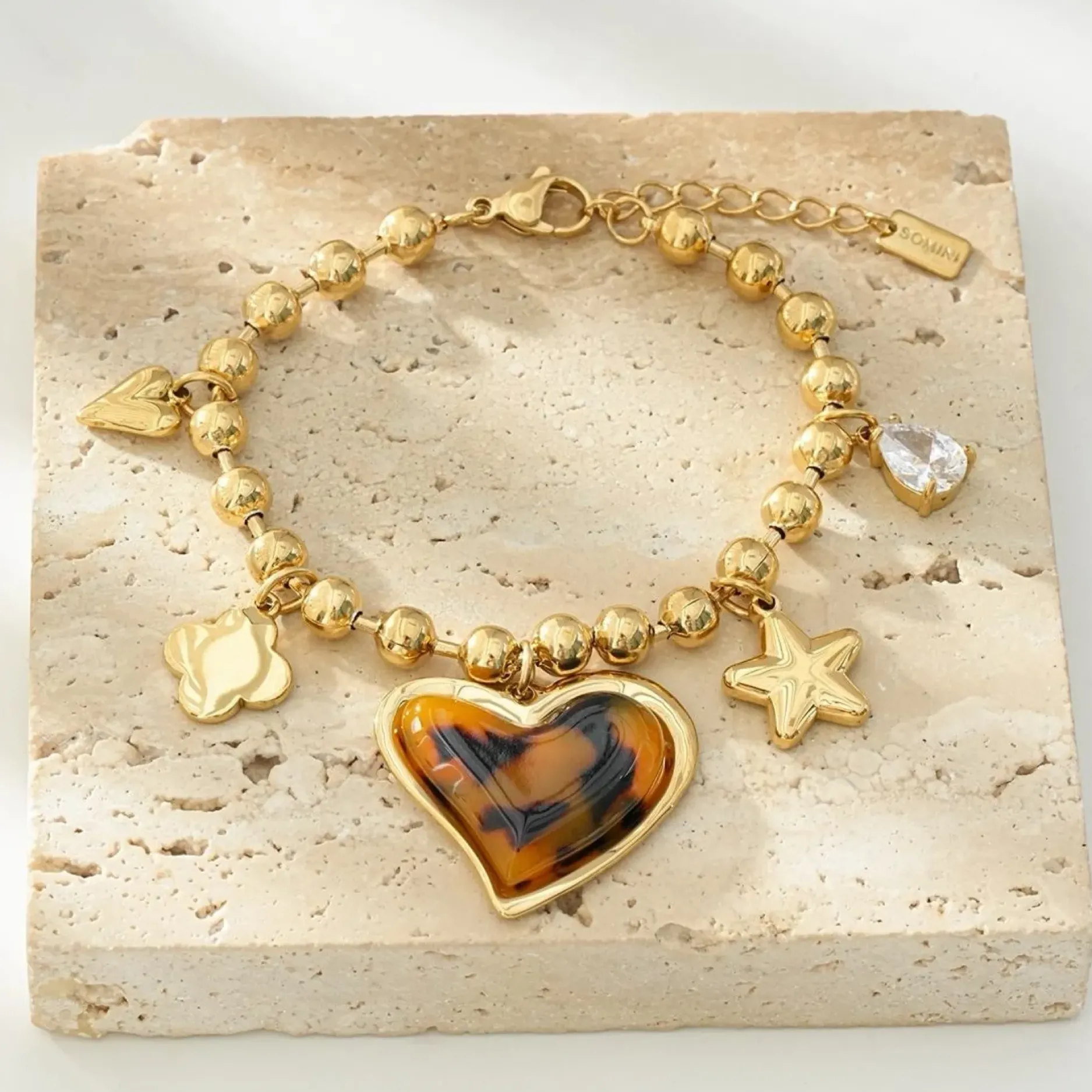 Ce bracelet à breloque dorée est une véritable déclaration de style, avec sa breloque en forme de cœur marbré. La combinaison du doré et du marbré apporte une touche de sophistication, tout en restant douce et délicate. Ce bracelet est conçu pour ajouter une dimension élégante et moderne à votre poignet, tout en étant suffisamment subtil pour s’adapter à tous les styles.