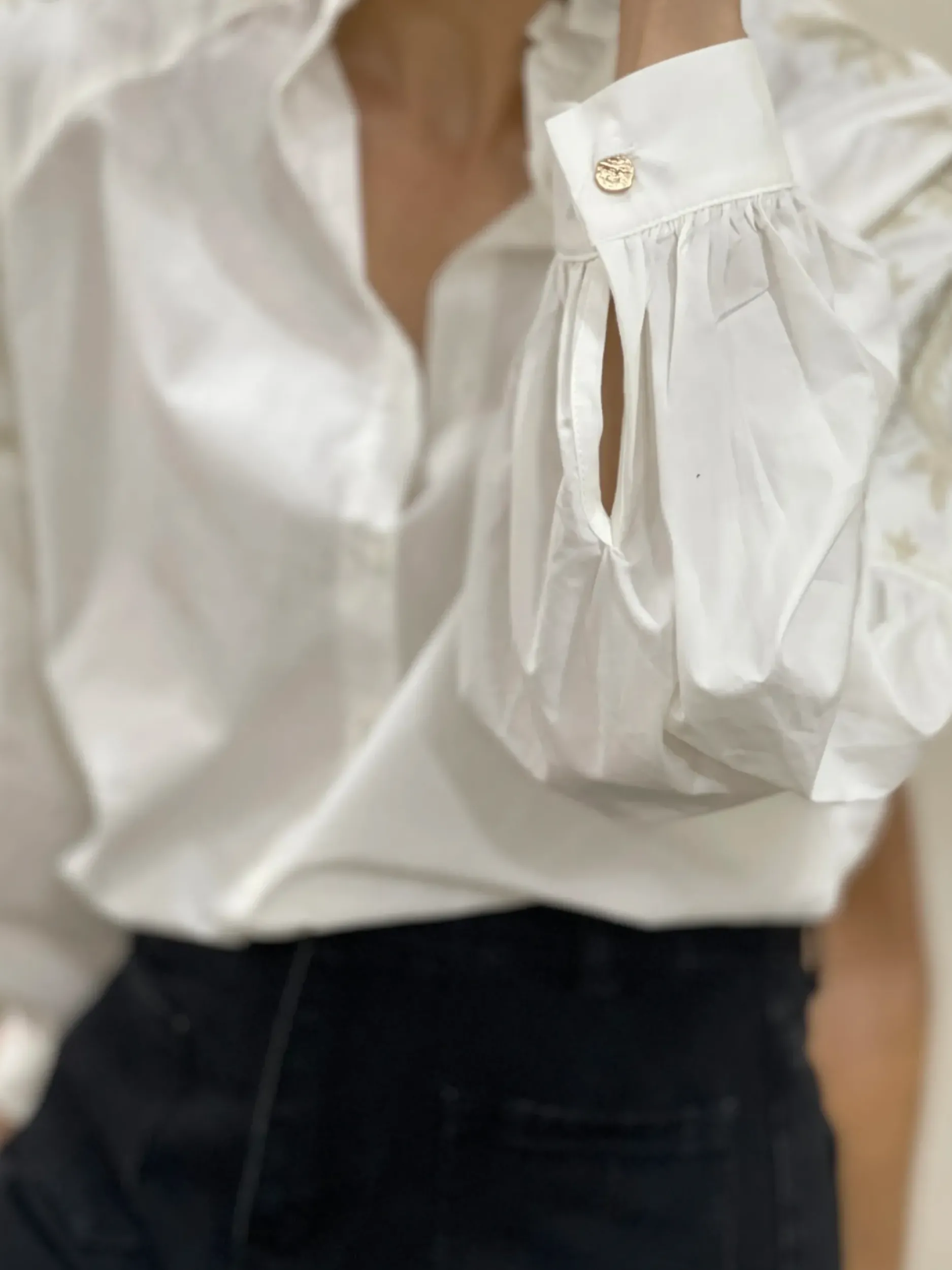 Cette chemise écru raffinée est sublimée par des détails délicats de broderie dorée sur les manches, offrant une touche d’élégance et de féminité à votre tenue. Ses boutons dorés sur les manches et le col ajoutent une note chic et sophistiquée, parfaite pour les occasions spéciales ou pour apporter du glamour à vos looks quotidiens. Fabriquée en 100% coton, elle est à la fois douce et respirante, idéale pour un confort optimal.