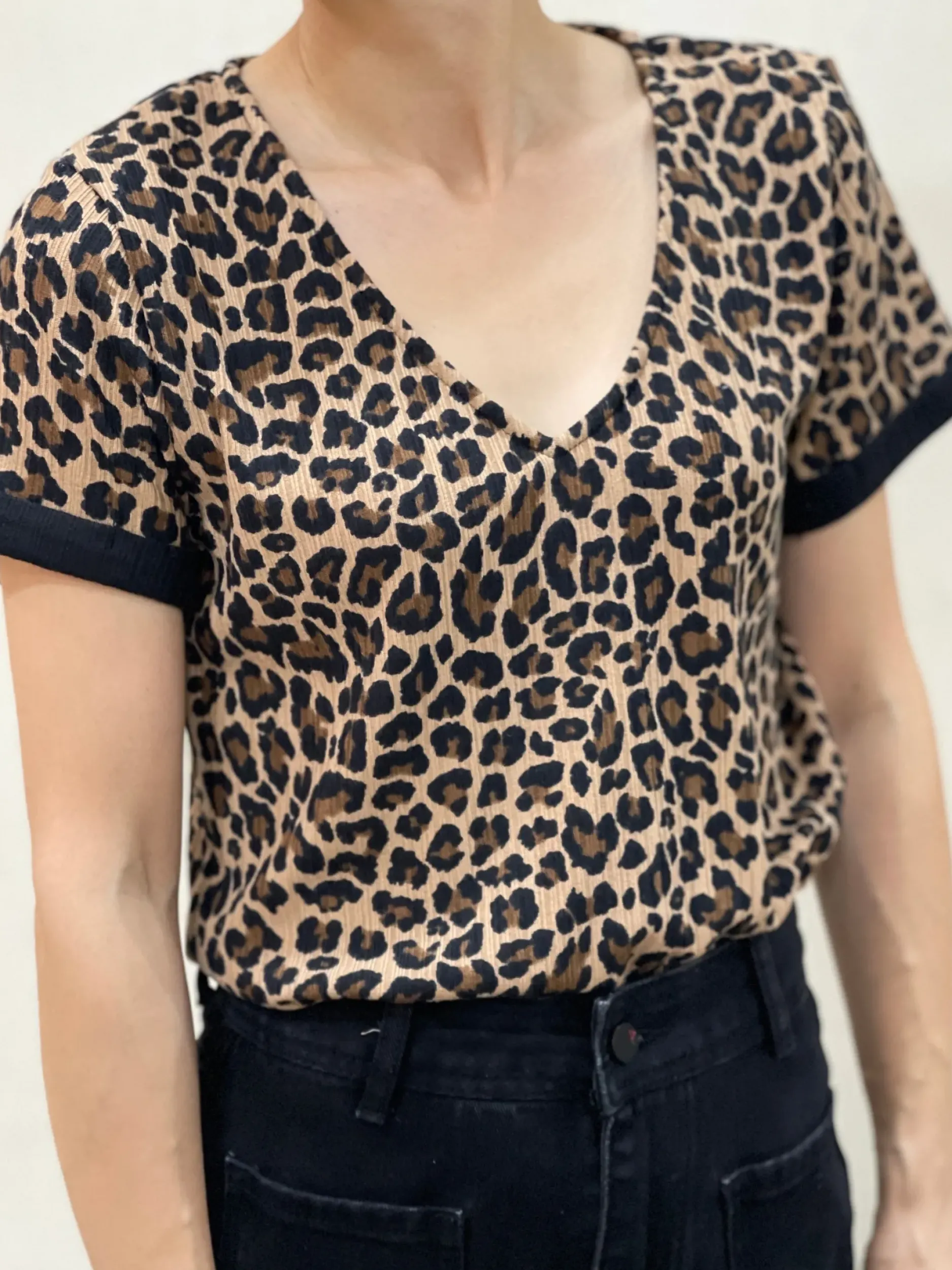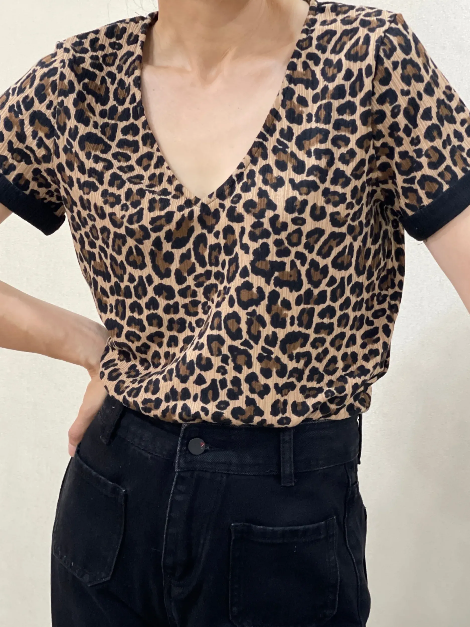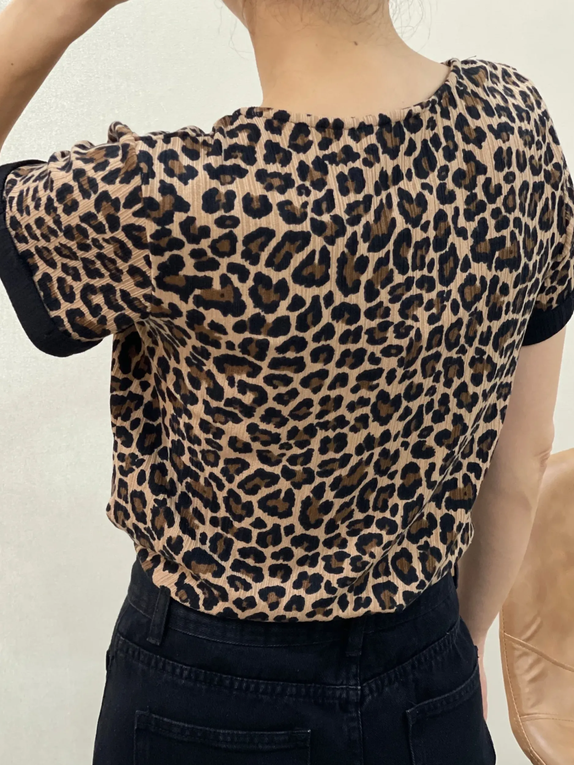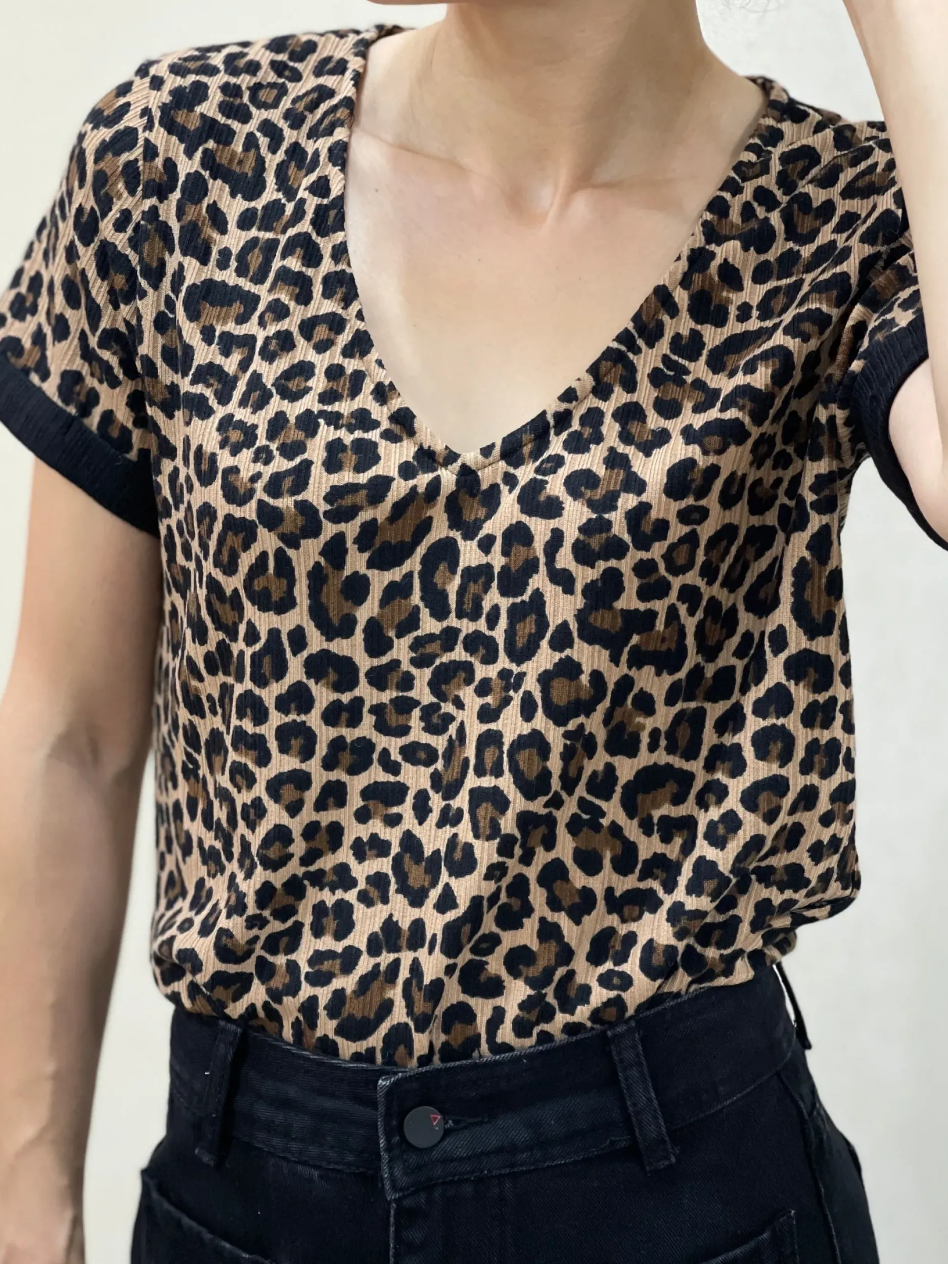Découvrez notre Tee-shirt Léopard Revers! Avec ses manches courtes, son encolure en V et son imprimé léopard, ce tee-shirt vous apportera une touche de style sauvage. Fabriqué en polyester et élasthanne, il offre un confort et une coupe parfaite. Disponible en tailles S à L.