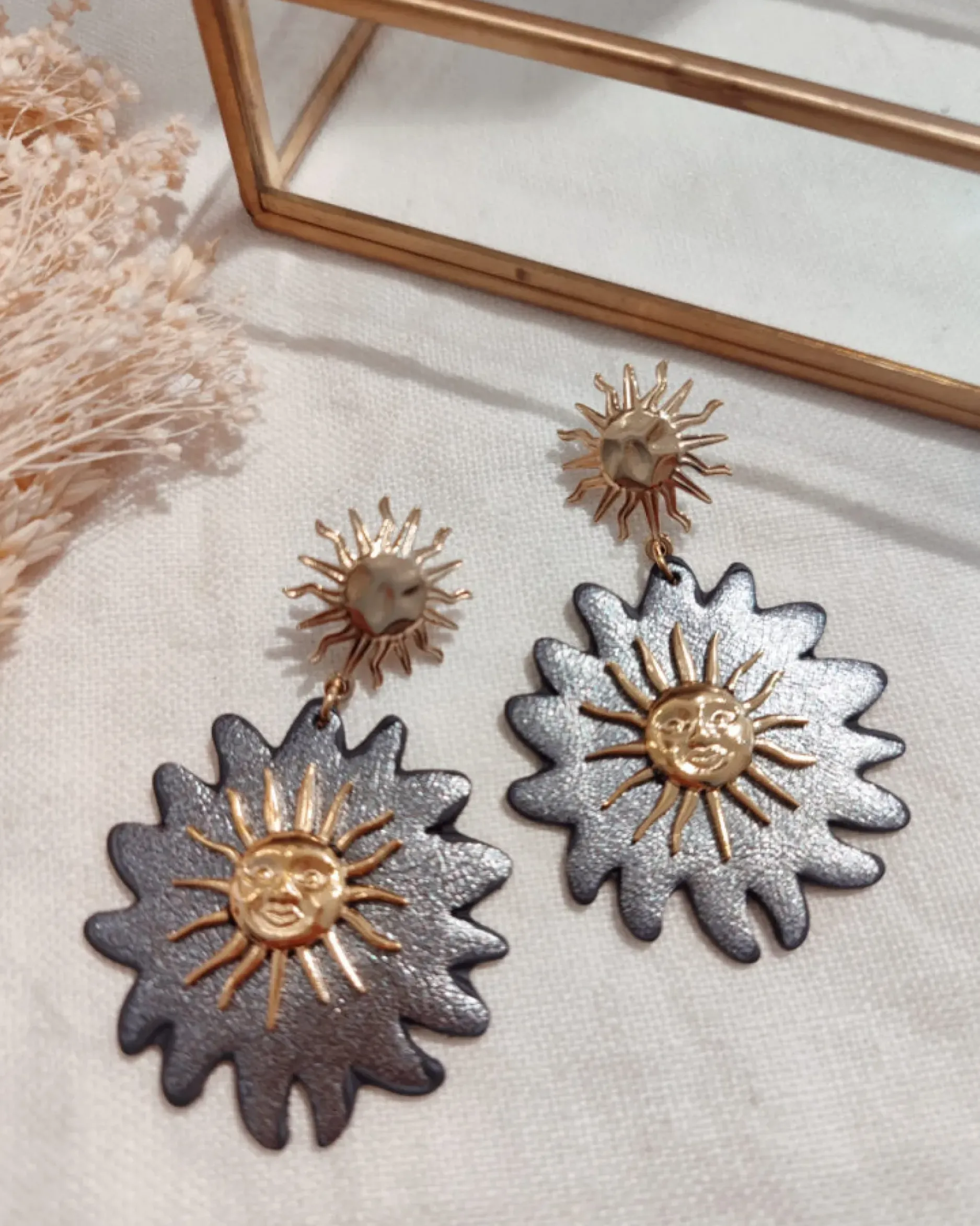 Ajoutez une touche de soleil à votre tenue avec nos boucles d’oreilles en similicuir noir et acier inoxydable. La boucle en forme de soleil est dorée pour un look élégant et tendance. Parfait pour une journée ensoleillée ou pour mettre en valeur vos tenues sombres.