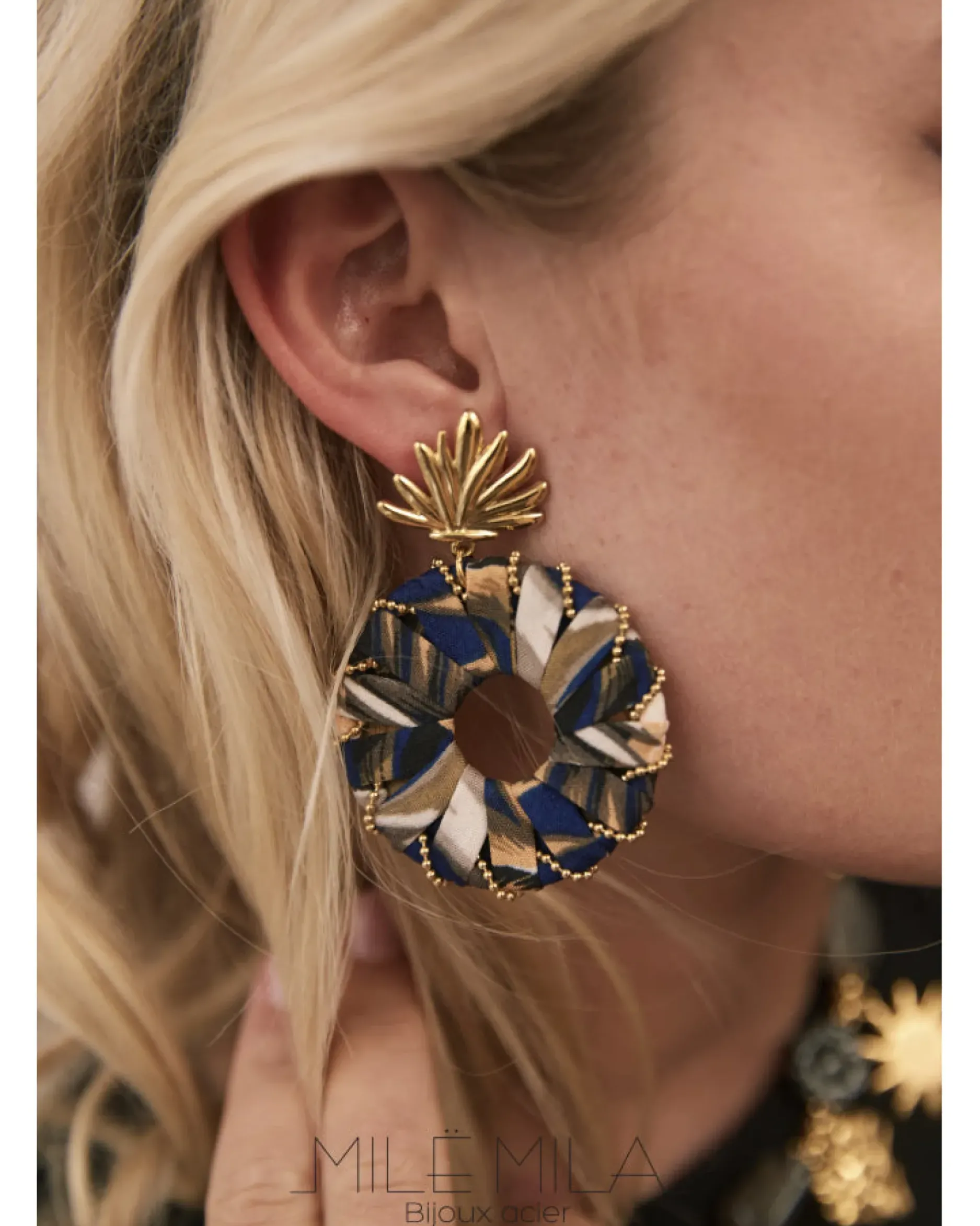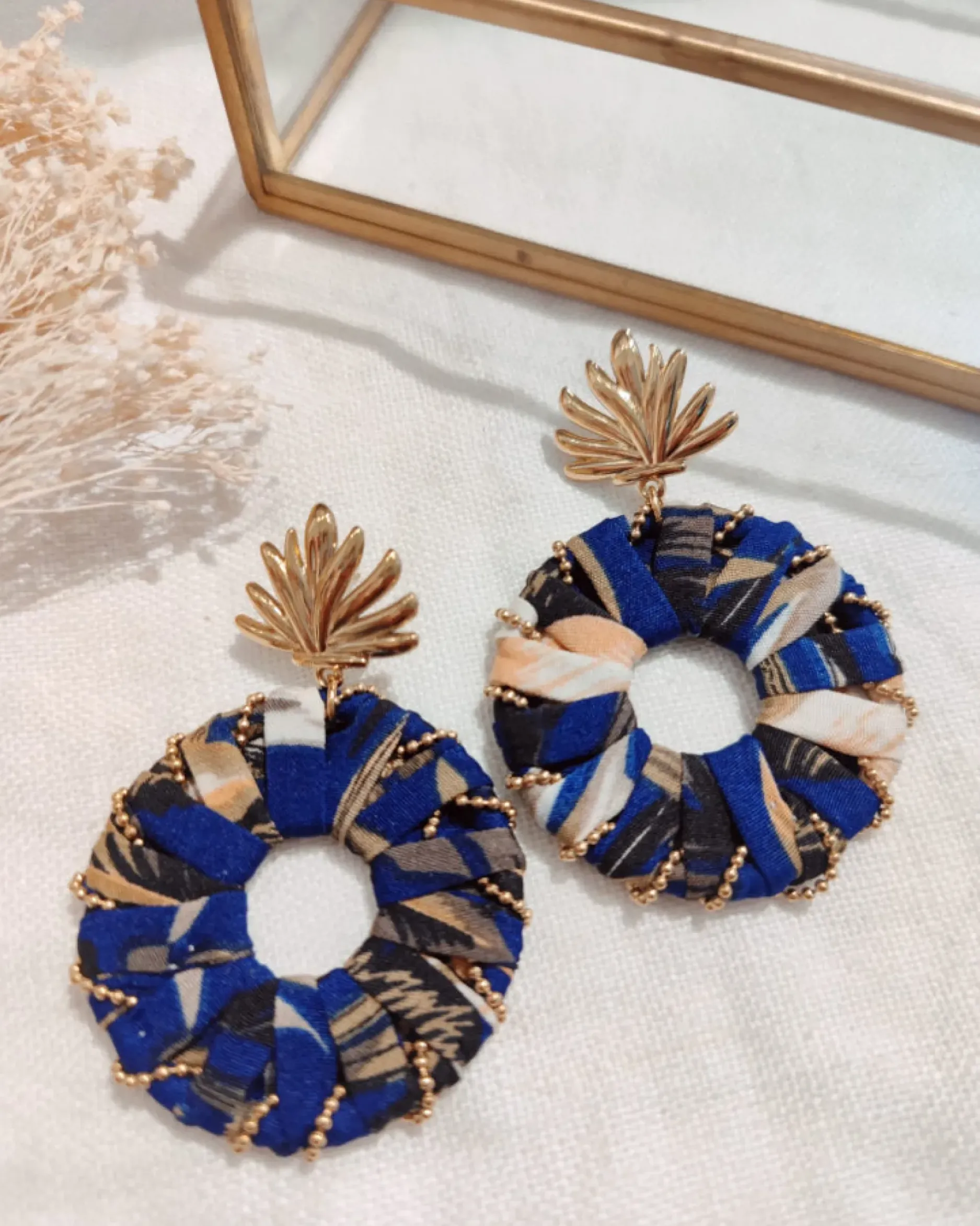 Transformez votre look avec les boucles d’oreilles B.O Tissu Bleu ! Fabriquées avec un tissu bleu foncé et des accents dorés, elles rehausseront n’importe quelle tenue. Les crochets en acier inoxydable garantissent leur durabilité et leur confort toute la journée. Ajoutez une touche de couleur et de style avec ces boucles d’oreilles uniques.