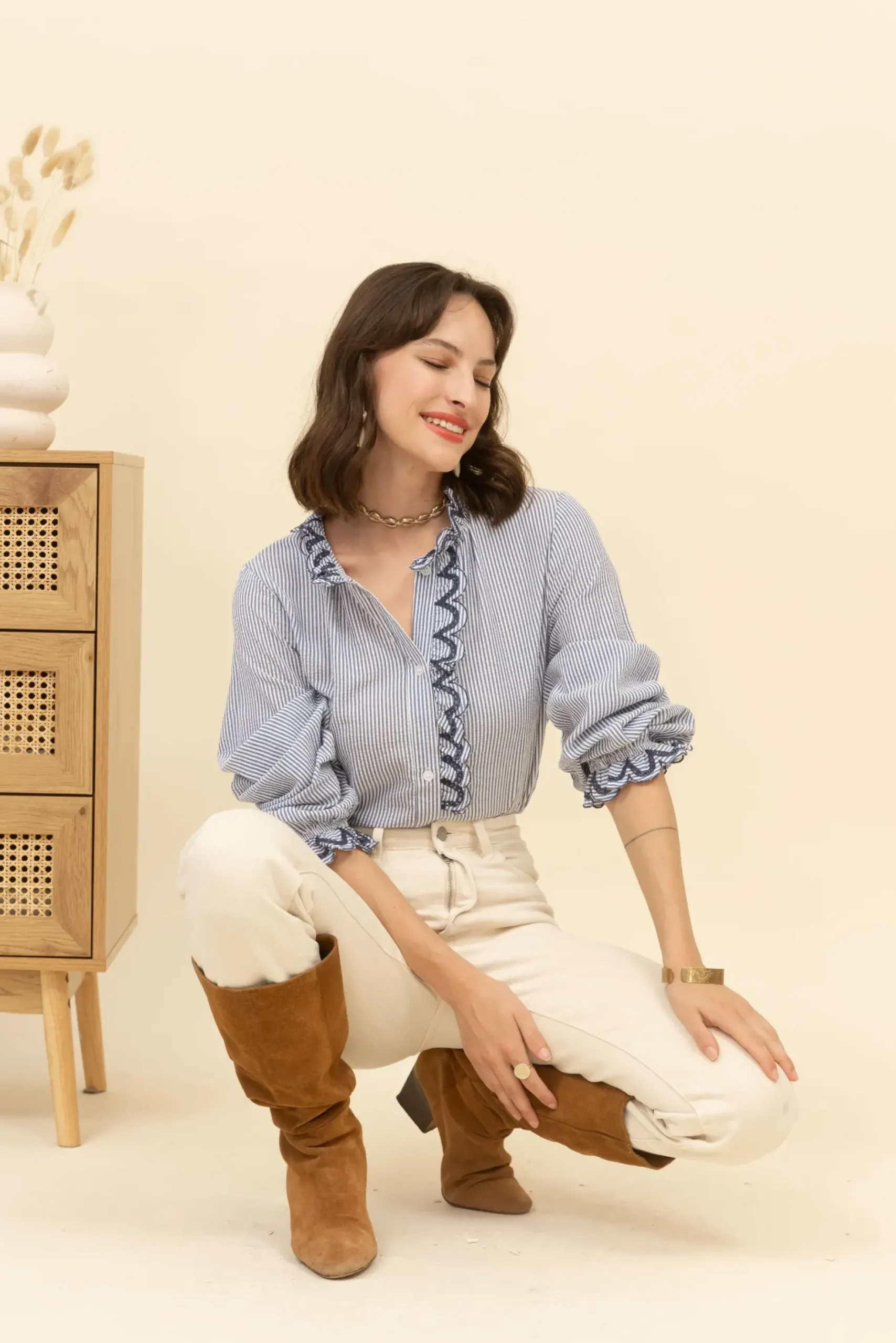 Cette chemise en coton rayé bleu et écru allie élégance et originalité grâce à ses détails subtils. Confectionnée en 100 % coton, elle garantit confort et légèreté tout au long de la journée. Les rayures classiques bleu et écru apportent une touche de fraîcheur intemporelle, tandis que les détails de « froufrous » sur les bords et le long de la patte de boutonnage ajoutent une note féminine et sophistiquée. Disponible en deux tailles, S/M et M/L, elle s’adapte à différentes morphologies tout en offrant une coupe fluide et confortable.